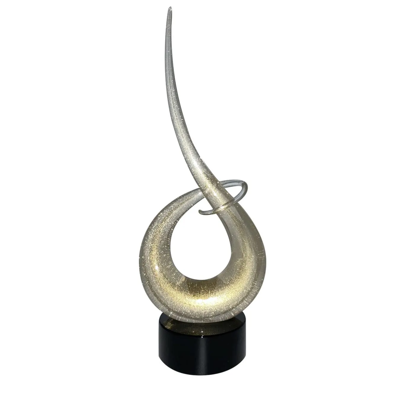 This piece reinterprets a classic design with modern flair, revealing the true beauty of glass to subvert traditional art norms. Entirely fashioned of Murano glass combined with gold foil, this sculpture is shaped into a sinuous knot with a wide loop and delicately tapered ends. Marked by a singular dynamism and textural balance, this glass masterpiece will be a singular addition to a console, sideboard, or dining room table.