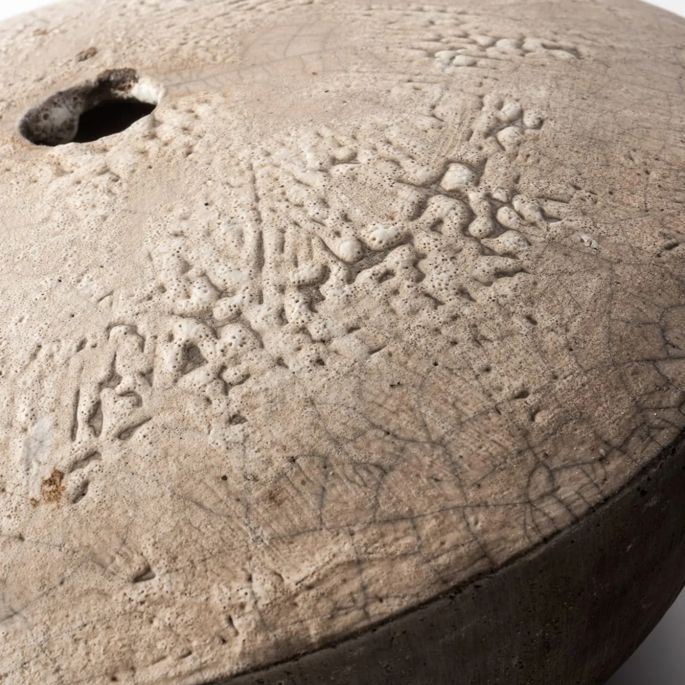 Actualization of the conflict between darkness and daylight, this ceramic sculpture/vase will be equally apt to showcase dried greenery or stand-alone serving a merely decorative function. It was handcrafted by artist Nino Basso following the Japanese raku method, resulting in a lighter, bulging top with a textured surface that contrasts with the semi-spherical body accented in anthracite gray without oxides. Unglazed for a raw feel, it is delivered with care instructions.