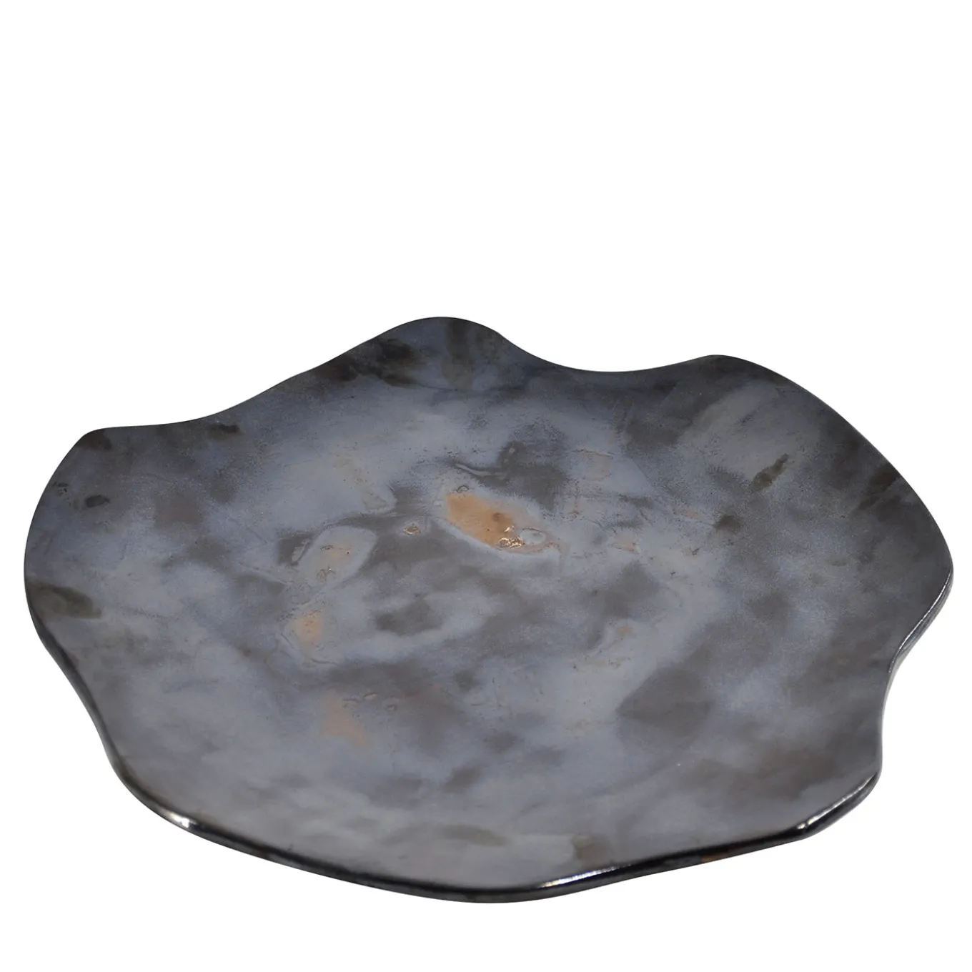 A decorative ceramic plate featuring a fluid, irregular silhouette with pronounced edges and a glossy dynamic texture. Its surface showcases metallic reflections and gradations from bluish gray to burnt copper tones, with concentrated copper hues in the center resembling illuminated craters at night. With a generous diameter of approximately 36 cm, it offers a sculptural presence ideal for modern or eclectic interiors. Includes packaging, authenticity certificate, and care instructions.