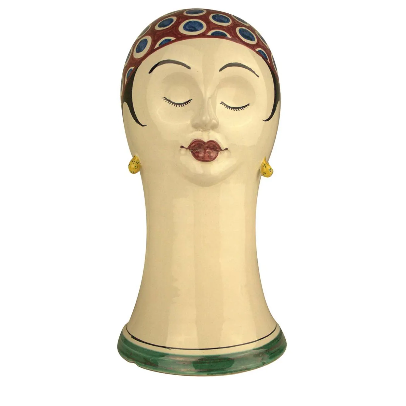 A variation of the Nuotatrice Sculpture, this elegant ceramic piece is crafted on the lathe and finished by hand. The hand-applied colors create vivid accents set against on the white of the long neck and heart-shaped face, highlighting the crimson-colored lips, the yellow of the earrings, the ornate swimmer’s cap in purple, blue, and white, from which neat black curls frame the face. This superb sculptural yet decorative piece can be displayed alone or with others from the same series on any surface of a contemporary or rustic interior.