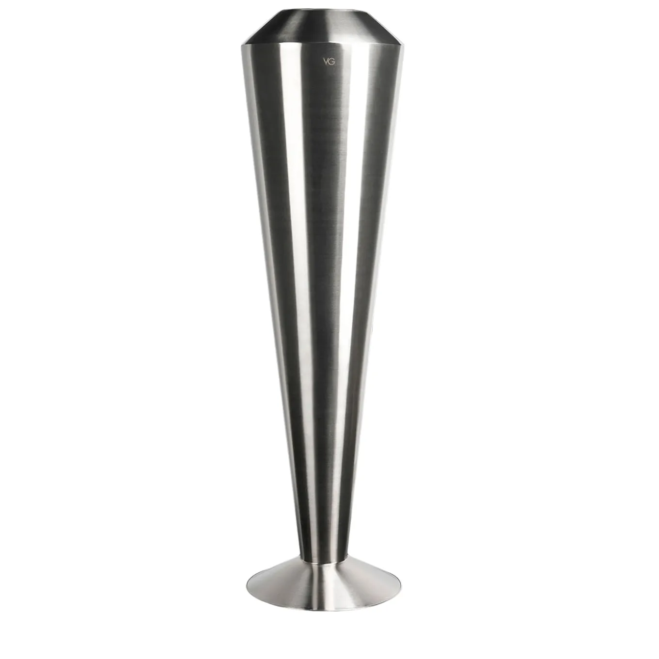 A stunning and iconic piece to complement the styling of a wedding space, special event, and home decor, this tall obelisk-shaped vase will make a statement in a refined and contemporary interior. Handcrafted of satin steel, it belongs to a series of elegant and luminous vases. Please contact the Concierge for further details.