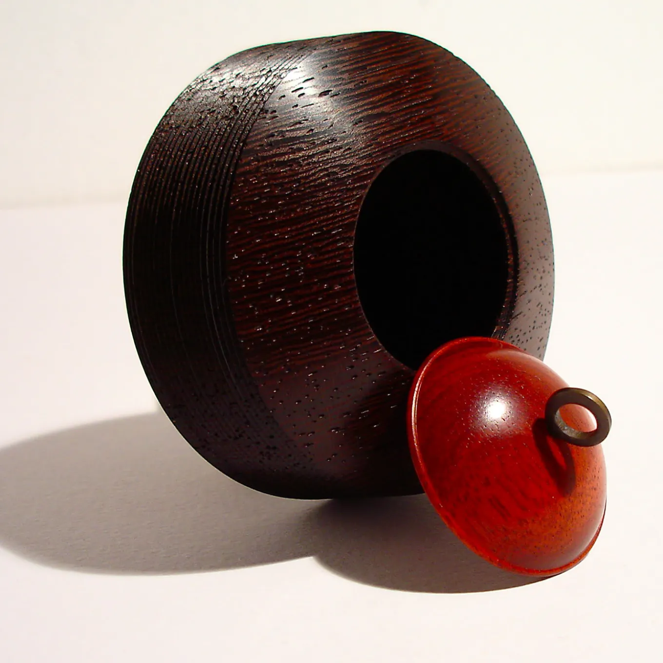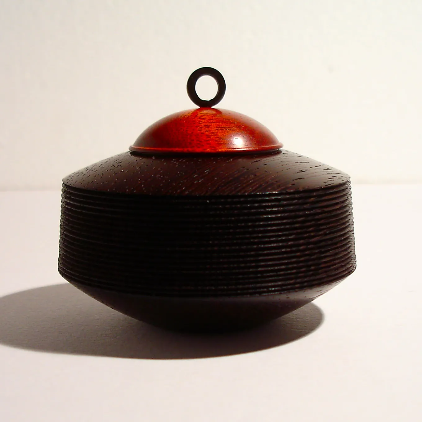 This small and lightweight box with lid is part of the Obox Collection characterized by simple shapes crafted by hand of prized woods with a distinctive ring knob in etched brass. A sophisticated addition to a personal collection and the perfect choice for any gift-giving occasion, this box features a tall, circular wengè base with delicate, horizontal ridges and a small dome-shaped lid of Muirapiranga boasting a stunning orange hue.