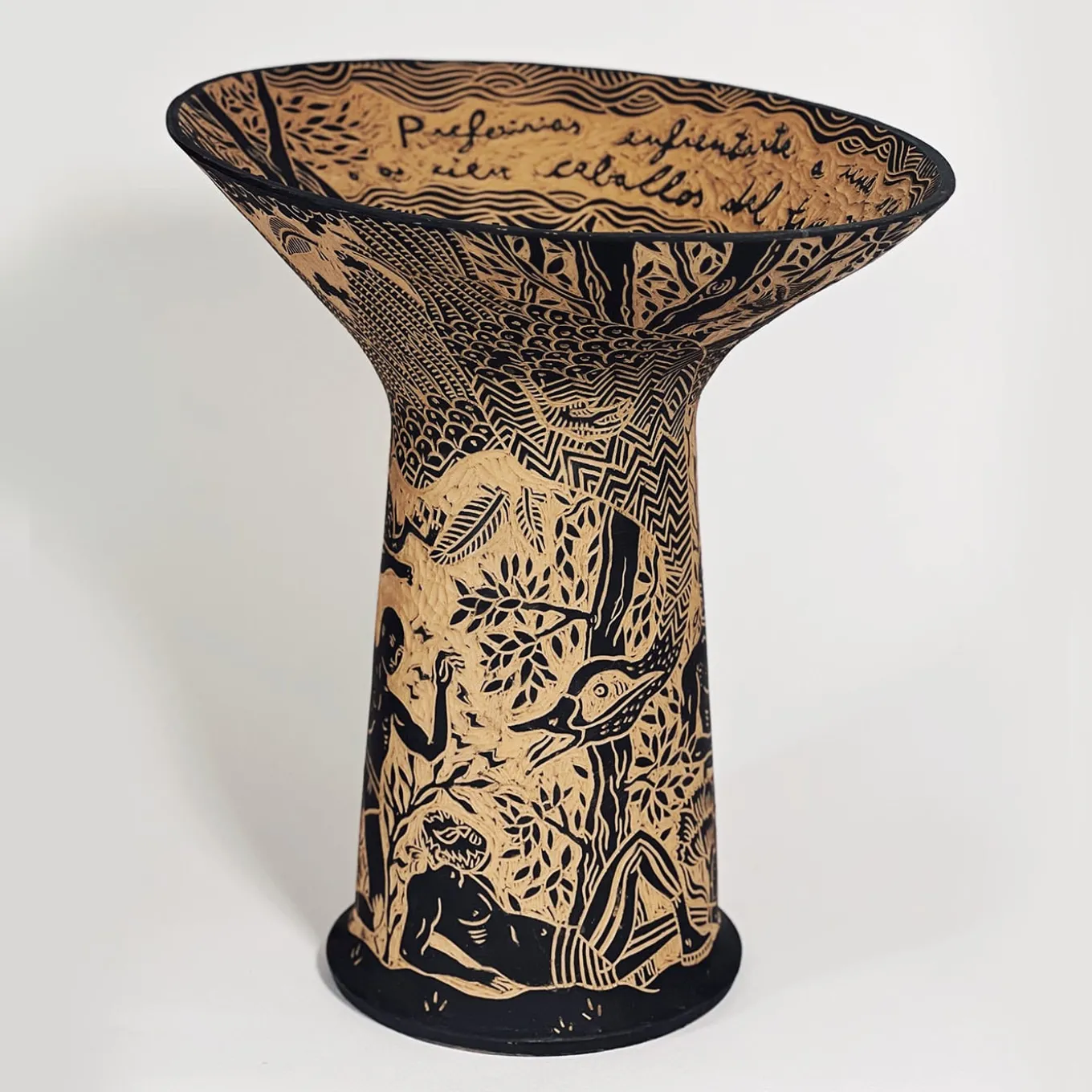 “Preferirías enfrentarte a una oca del tamaño de un caballo, o a cien caballos del tamaño de una oca?”. Wheel thrown vase, made in terracotta and decorated with black slip and sgraffito technique.