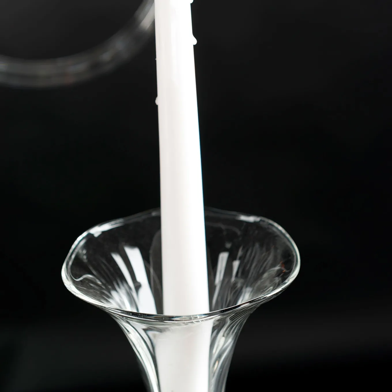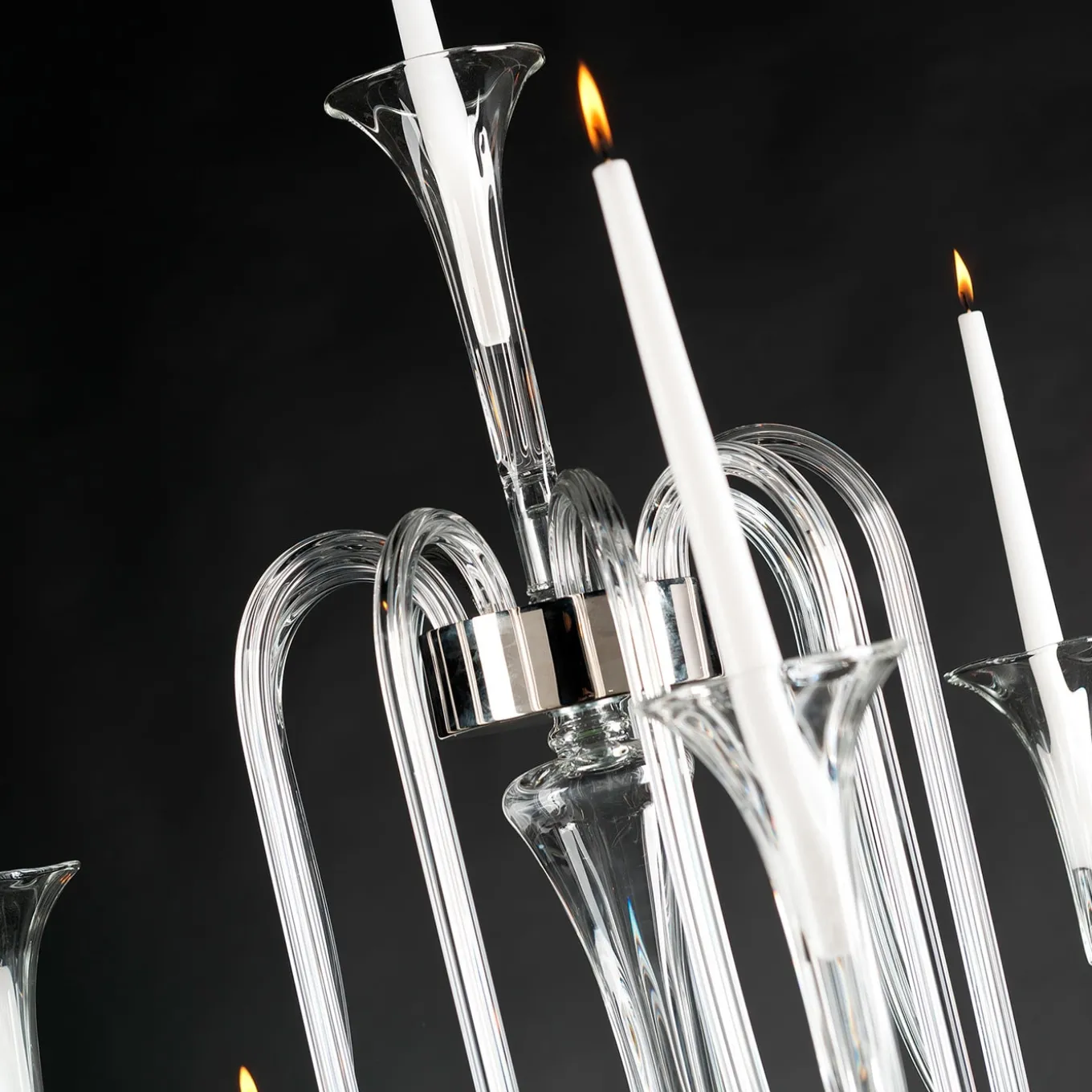 Fashioned of Pyrex®, this spectacular freestanding candelabra will create an intimate and regal ambiance in any sophisticated domestic or hospitality context. The slender structure is equipped with a total of 13 hook-like arms arranged in multiple tiers for a well-diffused illumination effect. It will splendidly enrich refined events such as weddings or birthday parties.