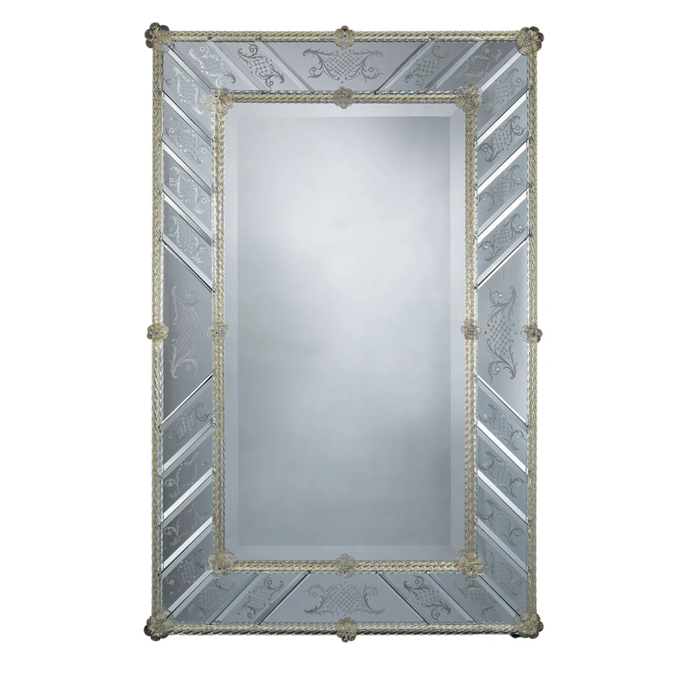 Elegant wall mirror featuring a frame composed of handcrafted beveled and engraved mirror glass segments that create a dynamic play of reflections. The frame is enriched with crystal torchon rods set against a warm gold background, interwoven with delicate glass flowers and 24kt gold leaf accents, resulting in a harmonious blend of luxurious forms and materials. Crafted with meticulous attention to detail, this piece elevates any wall space with refined sophistication.