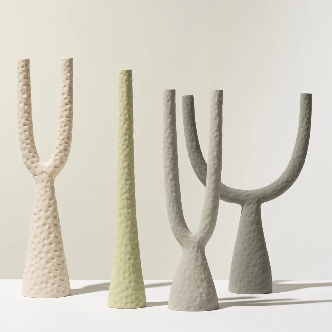 This candlestick features a tapered silhouette inspired by 1950s designs with soft, organic forms reminiscent of morandian still lifes. Created from a molded clay cast and finished with a velvety matte glaze applied by airbrush, it exhibits a textured, powdery surface that enhances the terracotta’s natural feel. Its muted lime shade and sculptural presence invite elegant combinations with matching vases and bowls from the same collection.