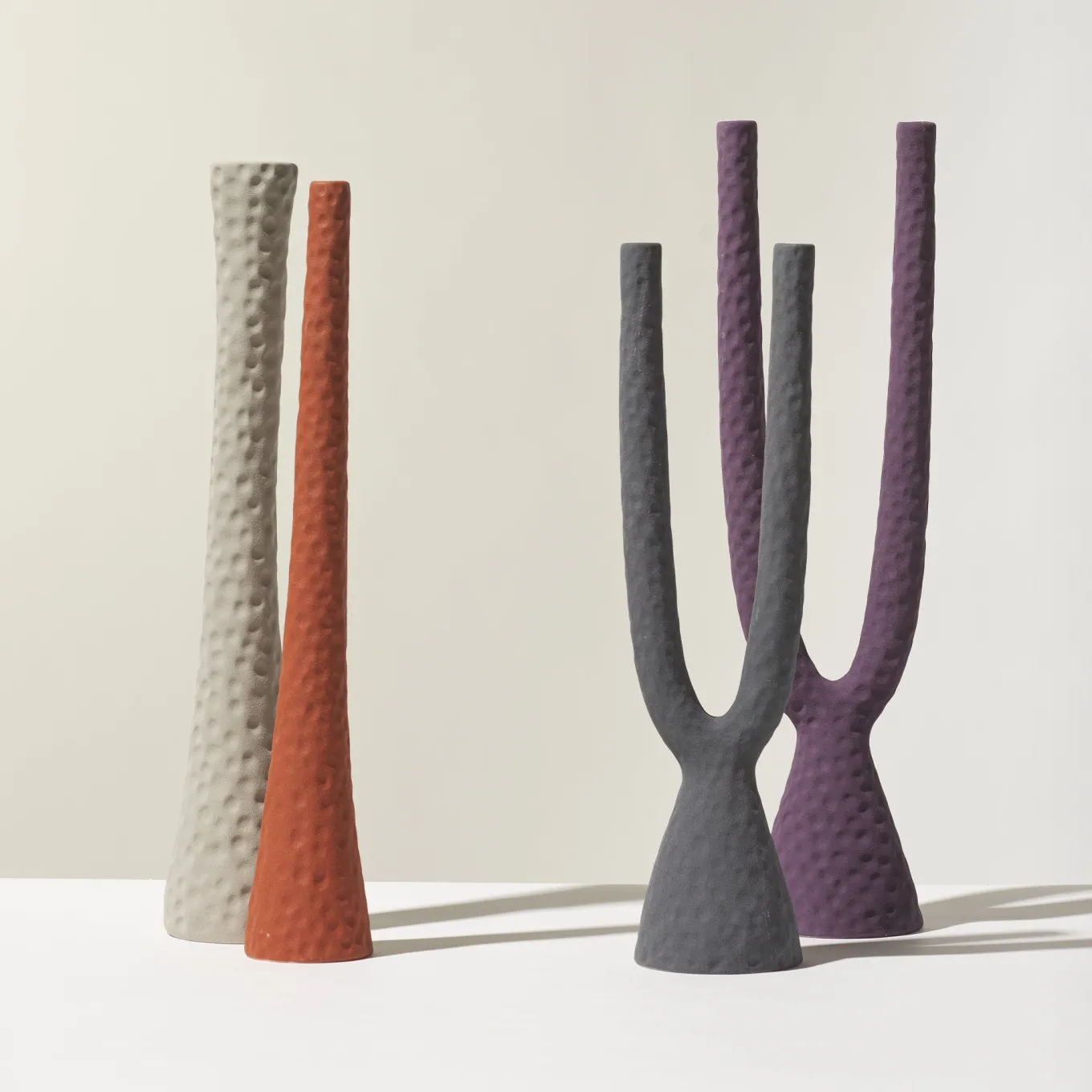 A matte finish candlestick inspired by early 1950s designs from Ceramica Gatti’s archive, featuring softly contoured, elongated forms reminiscent of Morandi’s still life compositions. The textured terracotta surface is enhanced by a powdery matte glaze applied via airbrushing, evoking the tactile quality of aged copper vessels. The piece invites complementary arrangements with matching vases and bowls to create a cohesive decorative ensemble.