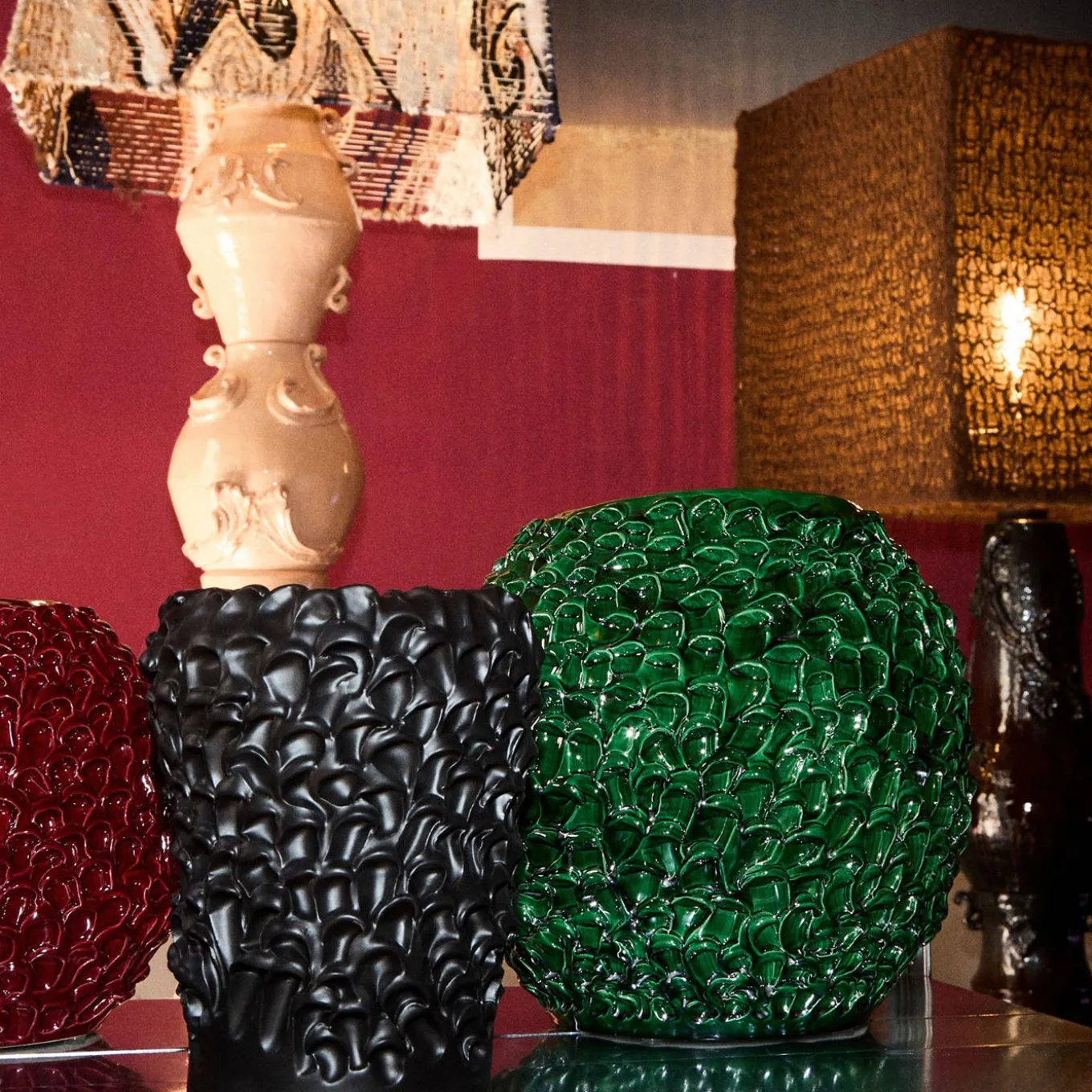 This medium round ceramic vase from the Onda series stands 25cm high and features a distinctive organic texture inspired by flowing water. Its lustrous green surface is enhanced by subtle silvery reflections that change with light. Crafted without moulds, each piece is unique with slight variations in size and color. Limited to just 20 numbered editions, it combines fluid design with refined elegance to enhance any interior.