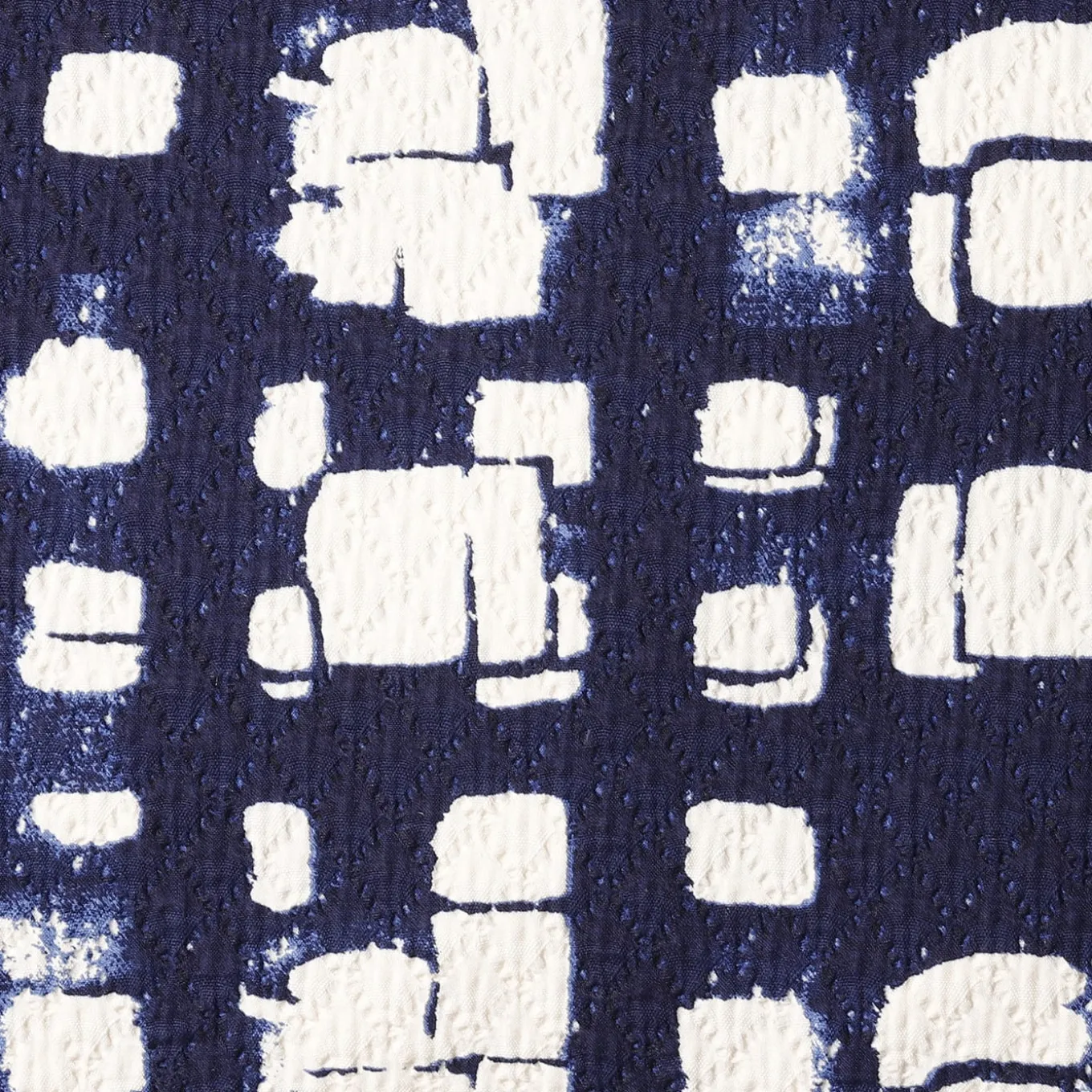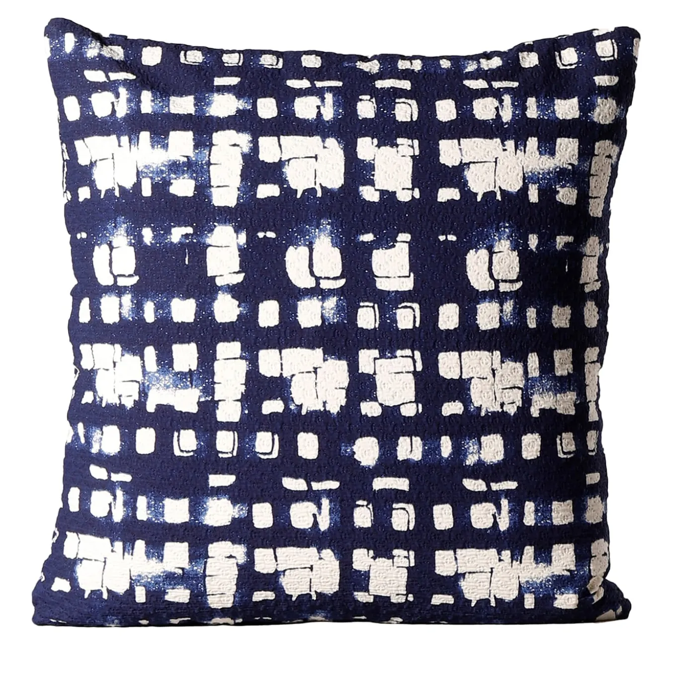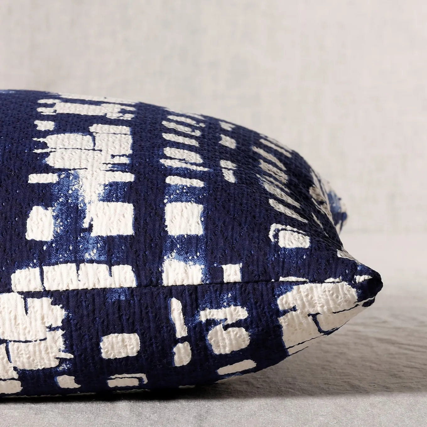 The indigo blue of the cotton jacquard pillow is etched away by the fluid white, creating a rippled effect that echoes the Aegean sea, seductive in its depths and mysteries.