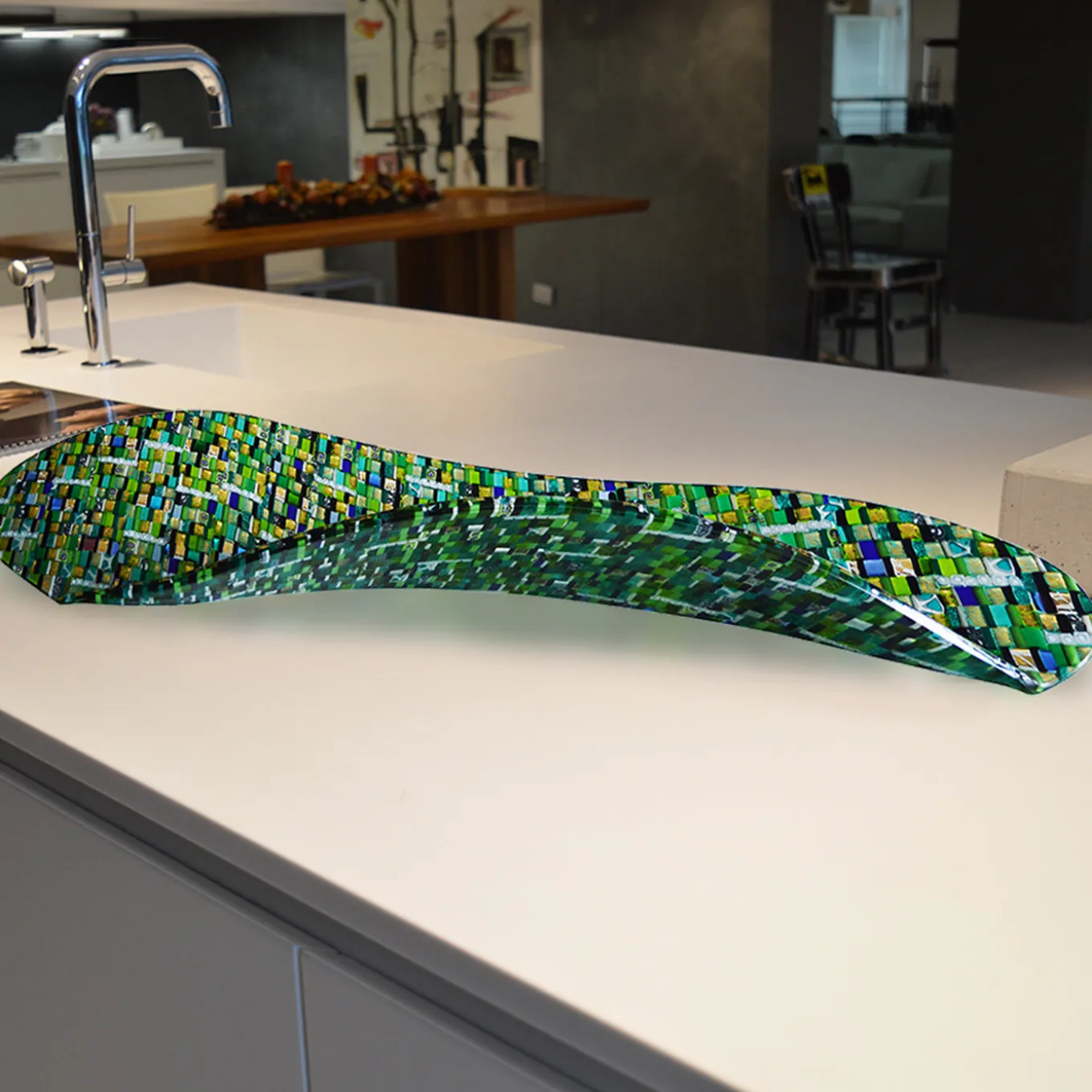 This centerpiece features a distinctive sinuous shape inspired by the venetian mosaic style, showcasing a rich green mosaic pattern with gold and silver leaf accents and special murrine. The design is enhanced with small inserts in shades of light blue, aquamarine, black, and venetian murrine, creating a dynamic and original decorative piece. Each element is carefully composed with variations in size due to its artisanal creation process.