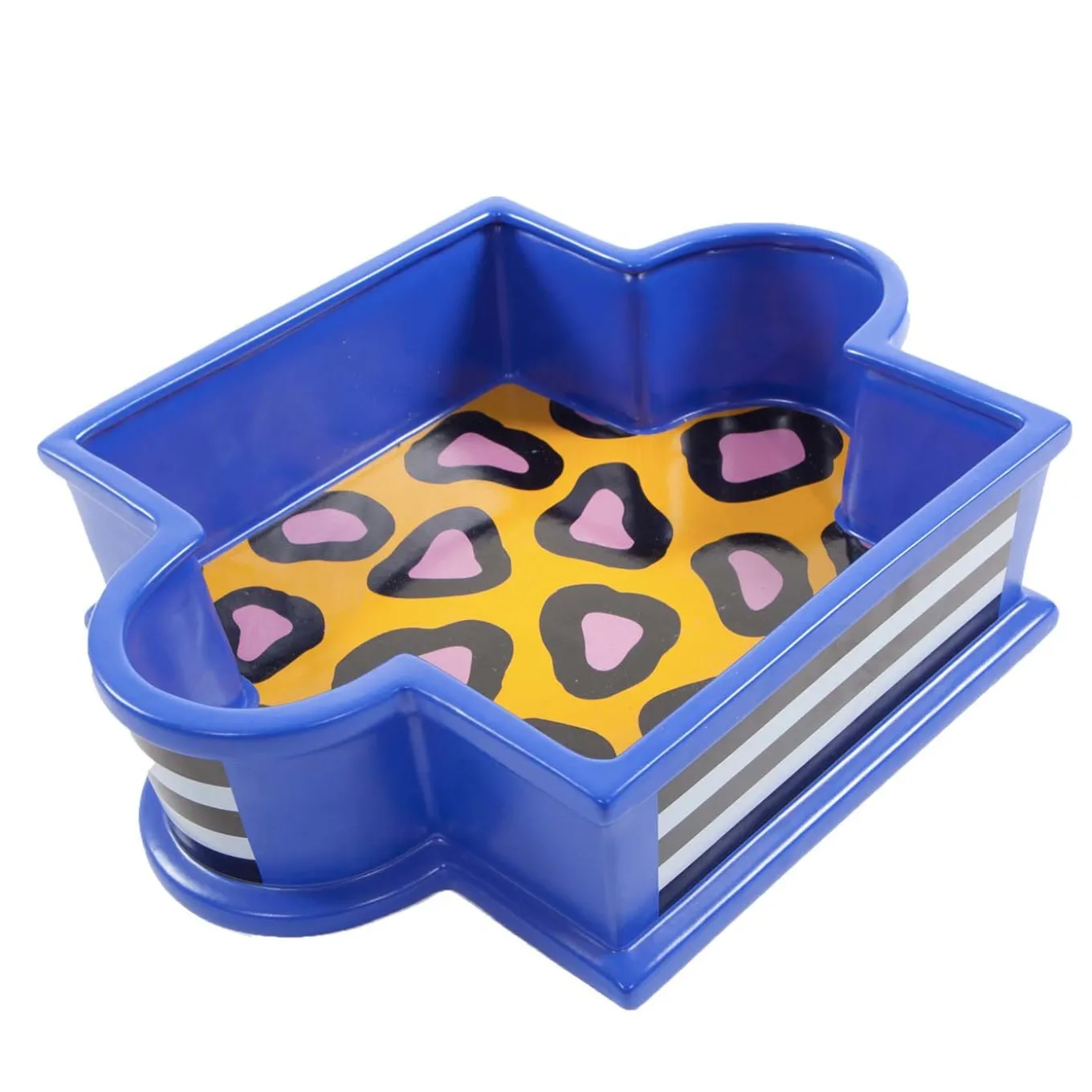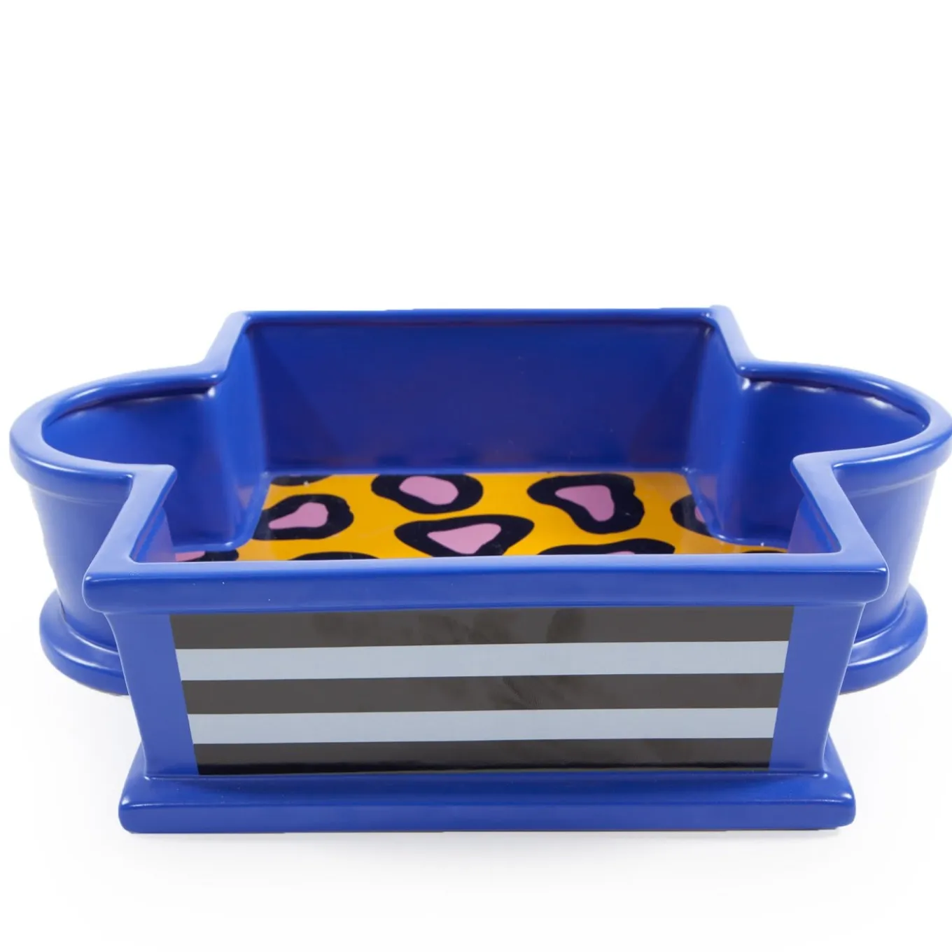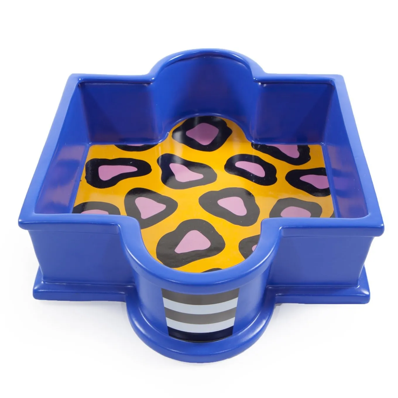 This superb object of functional decor was created in 1985 by the ingenious pattern designer of the Memphis artistic group, Nathalie Du Pasquier. The silhouette combines round elements and straight lines entirely made of ceramic. The blue of the tall edges is adorned with a black and white external insert, while the bottom of the bowl is elegantly painted with a playful rendition of jungle patterns in yellow, pink, and black. Showcased as a centerpiece or a display surface for sculptural pieces, this fruit bowl will make a statement in a contemporary decor.