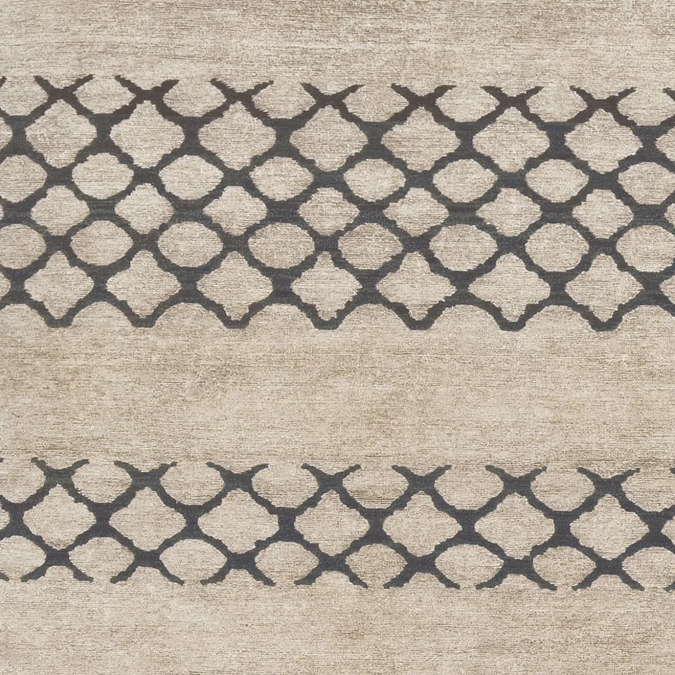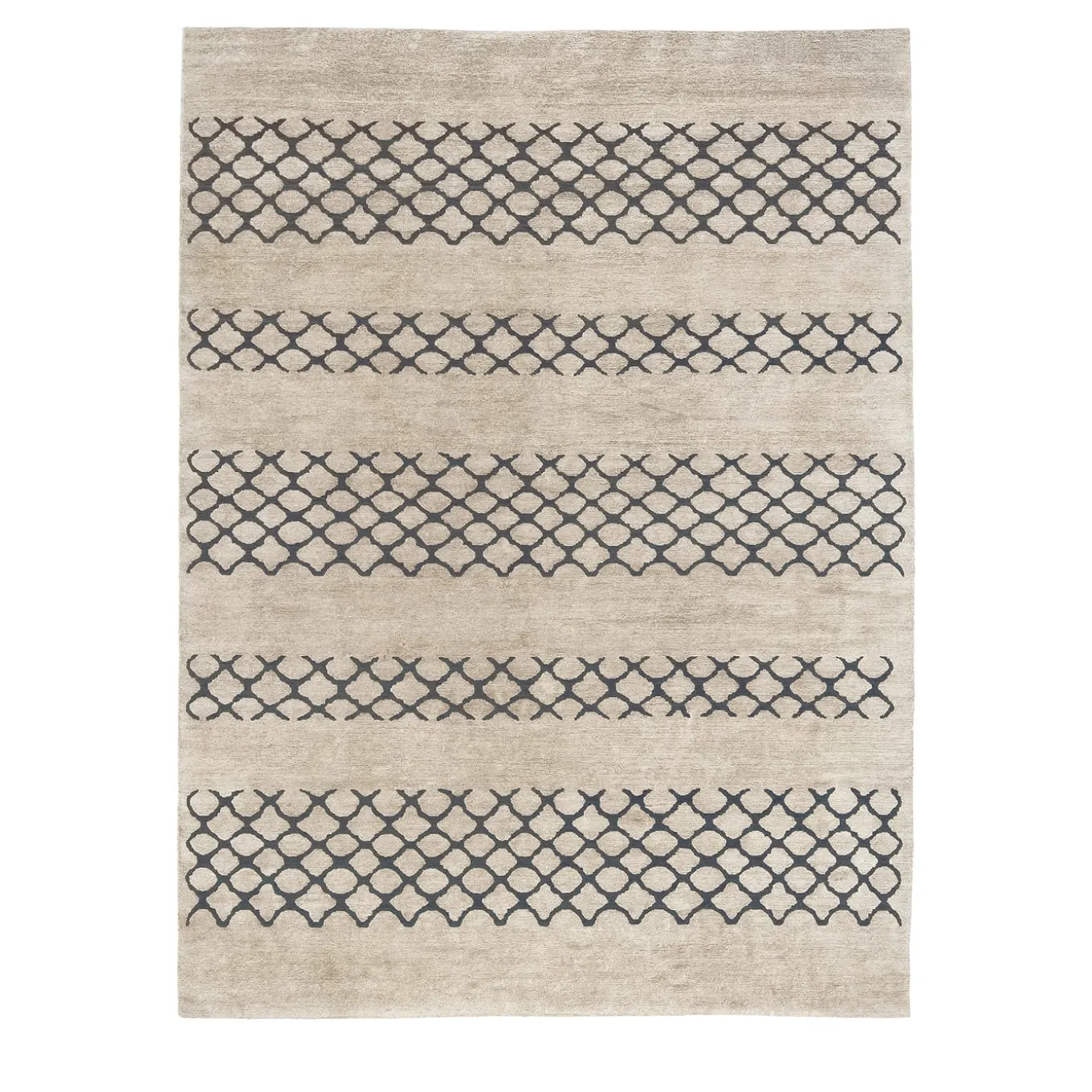 This magnificent rug was knotted by hand in Nepal using 55% natural linen and 45% wool. Its 100 knots make a piece in which the light beige of the background creates uniform stripes that interrupt the dark grey decorations running horizontally in rows of connected oval elements. The standard sizes are 170×240, 200×250, 200×300, 220×300, 250×300, 250×350, 300×400, 350×420, 350 x500, 400×600 cm for the rectangular rug and 250×250, 300×300, 400×400 cm for the square one. Custom sizes, colors, and materials can be ordered (please ask the concierge for prices).