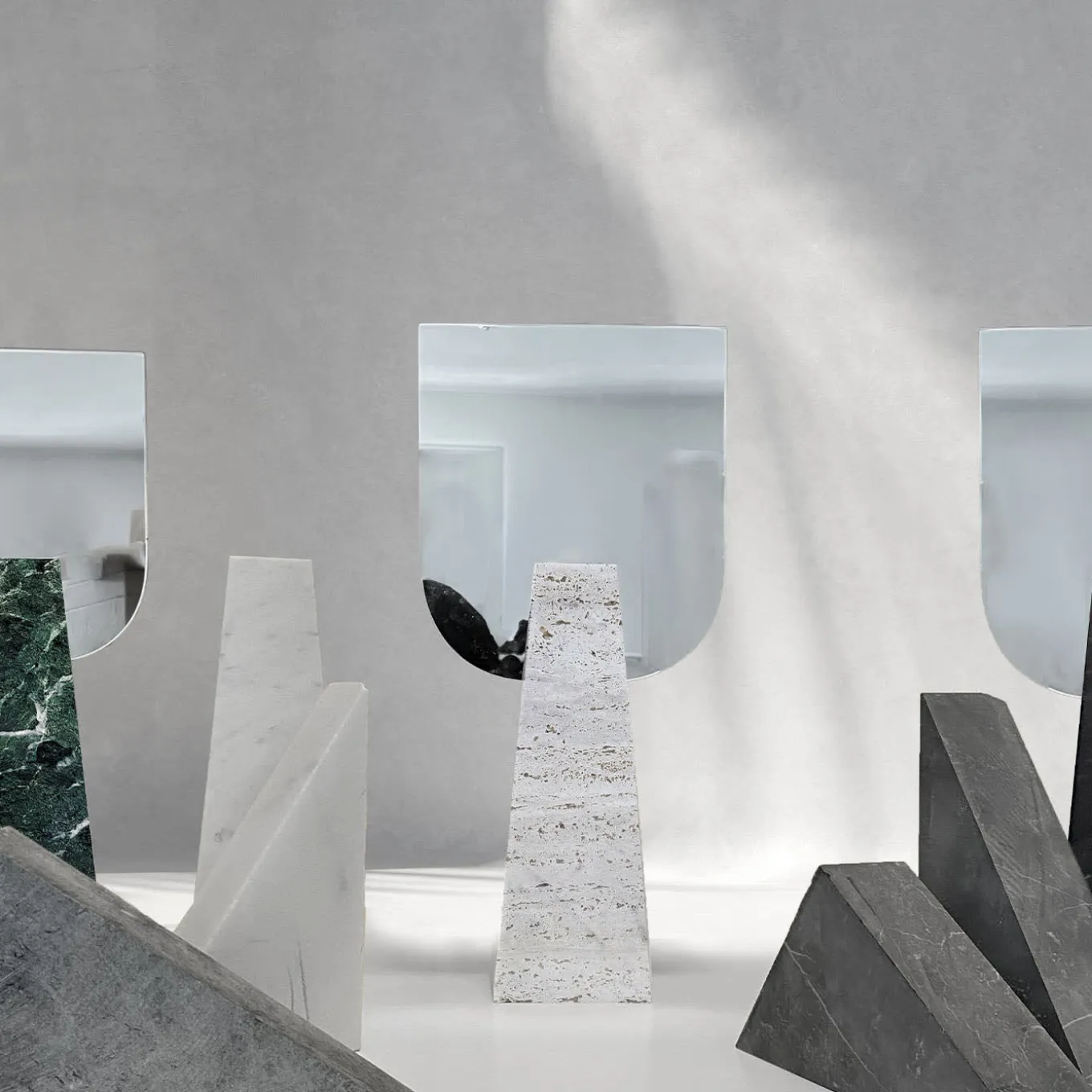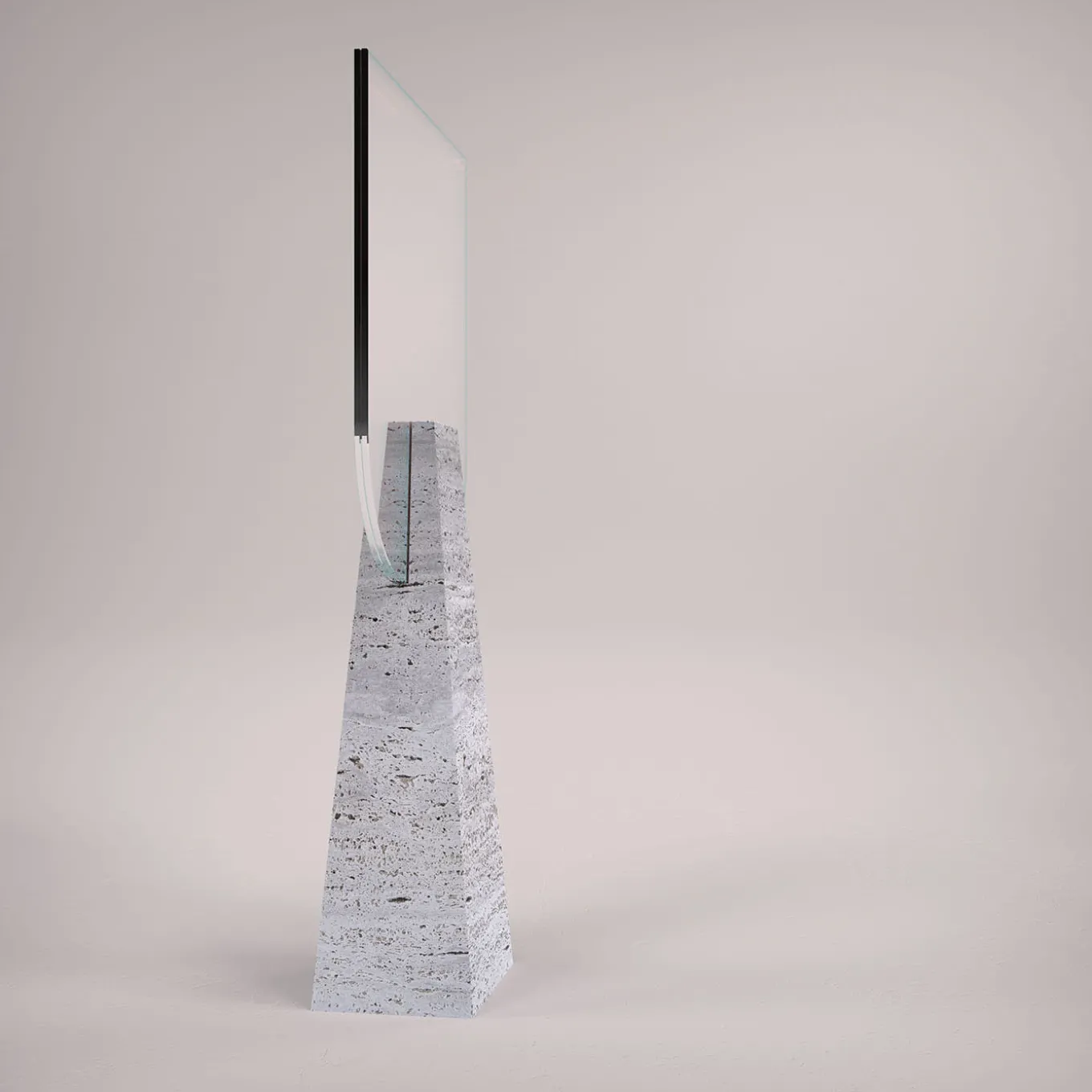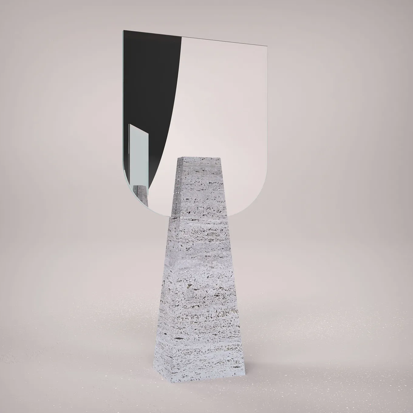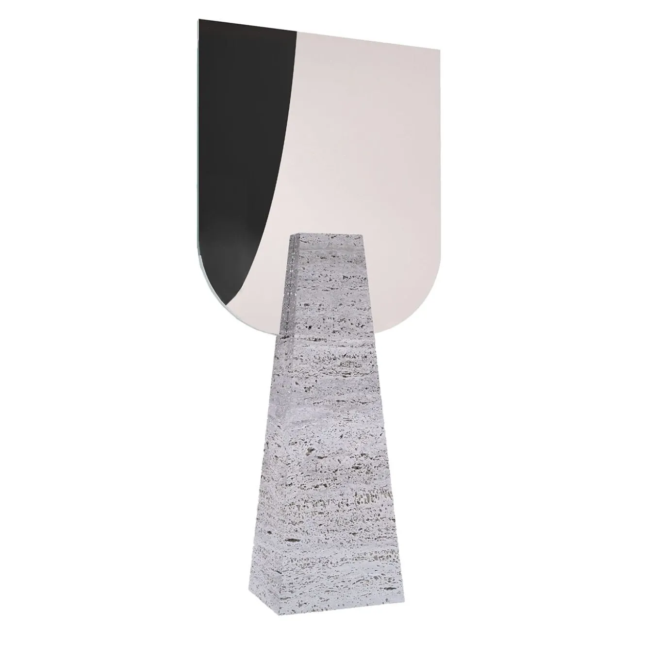 Actualization of the encounter between contemporary flair and Neoclassic imagery, this table mirror is sure to stand out with its rigorous sculptural look. A sturdy Travertine block offered in a truncated pyramidal silhouette supports a couple of shaped double-sided mirrors. Each piece is made to order, any differences from the pictured item are a testament to its exclusivity.