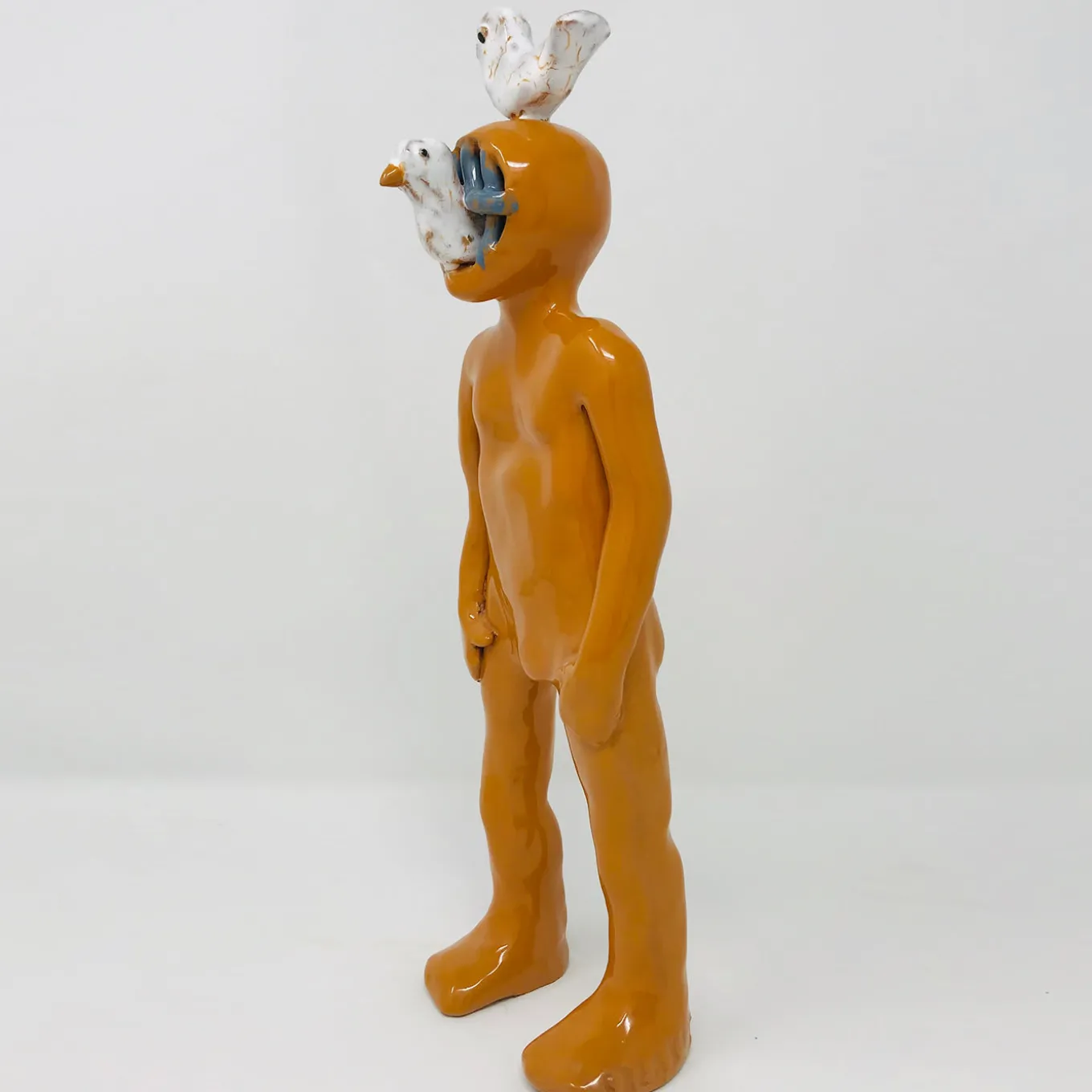 This singular sculpture from the Big Humans Collection flaunts an eclectic design of a deep-sea diver with a seagull perched on their head and another one peeking out from the mask. Molded, finished by hand, and hollowed out to avoid breaking in the kiln, the design is first fired at 960°C and consequently glazed before a final firing at 930°C to seal its glossy look. Slight differences from the pictured item are a testament to its artisan quality. Please ask the Concierge for customizations.