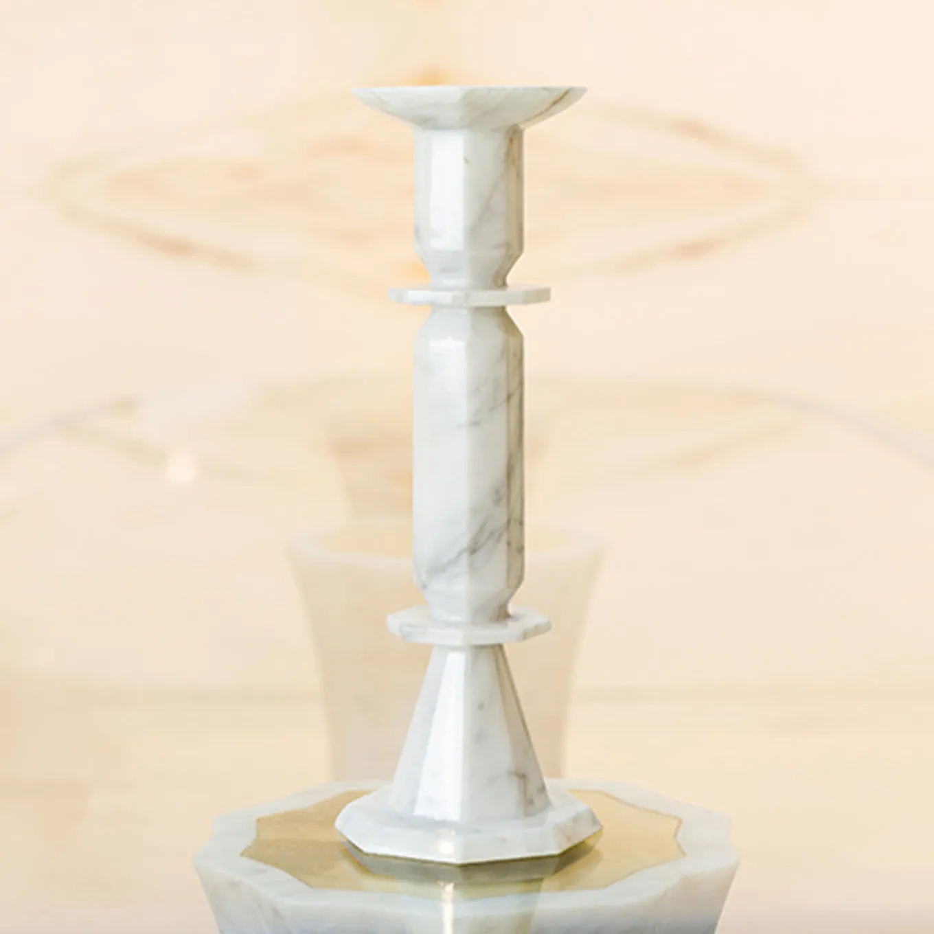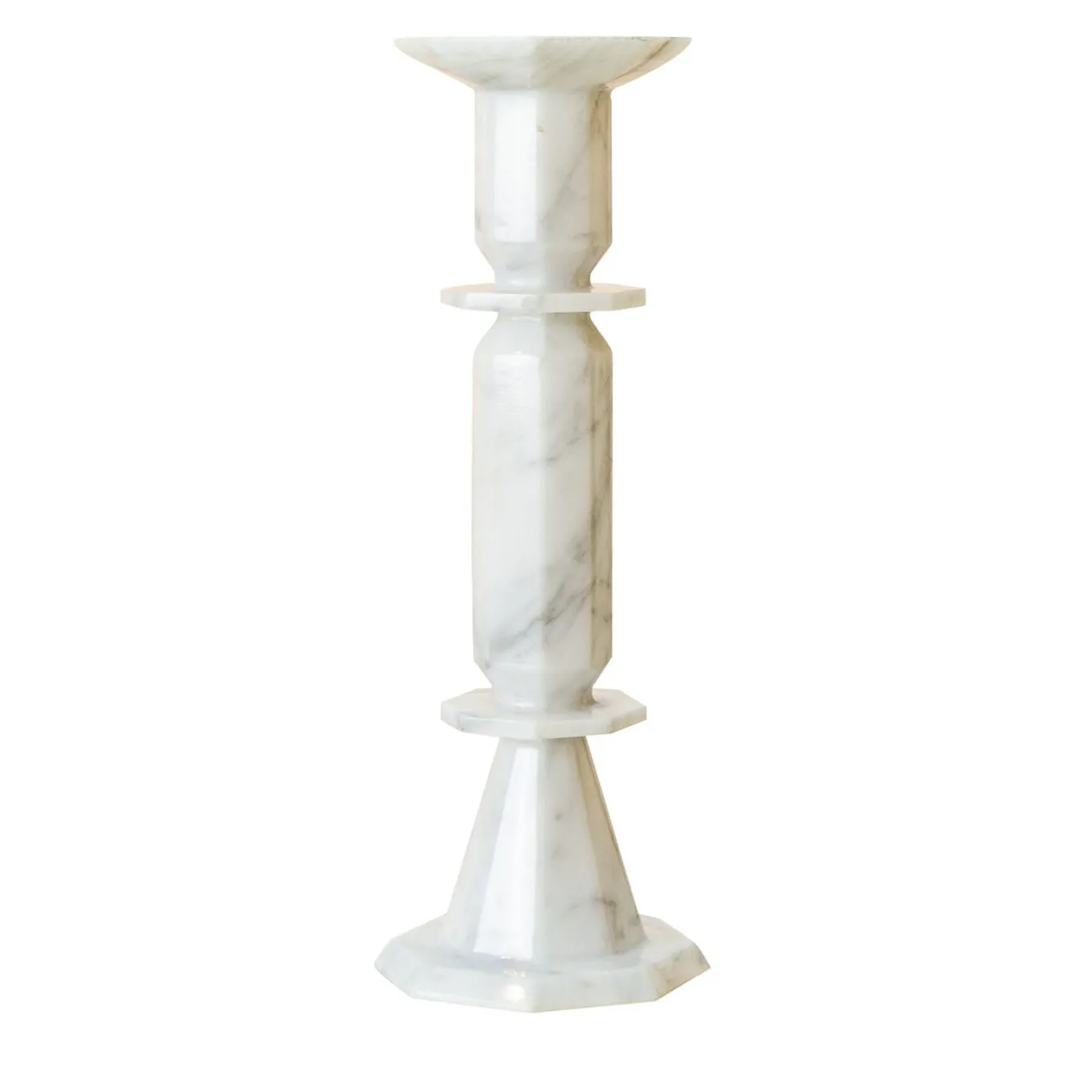 Oreadi Nix marble candlestick features a refined design crafted from a single block of white marble. Precision-machined using cnc technology, it presents a sculptural form with varied geometric contours. The candlestick combines durability and elegance, making it a distinctive piece for sophisticated interior decor. Suitable for enhancing table settings or accentuating decorative arrangements with its timeless aesthetic.