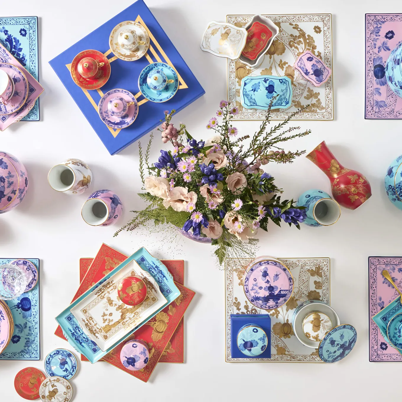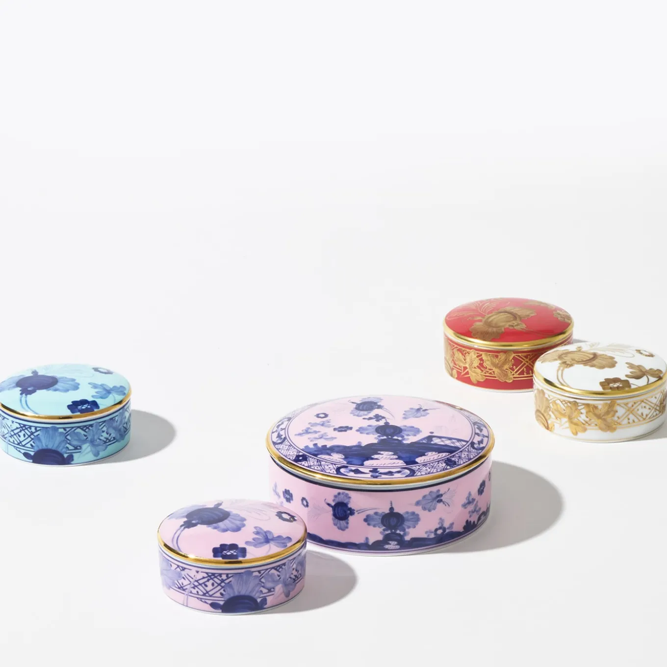 The large porcelain trinket box in the Azalea pattern with gold trim from the Oriente Italiano Collection features a delicate floral motif in blue, highlighted by distinctive gold accents against a soft pink background. Showcasing Ginori 1735’s signature craftsmanship, this elegant piece complements tableware, tea and coffee sets, and room diffusers. A refined addition to any décor, the collection transforms each porcelain element into a timeless work of art, perfect for elevating any occasion.