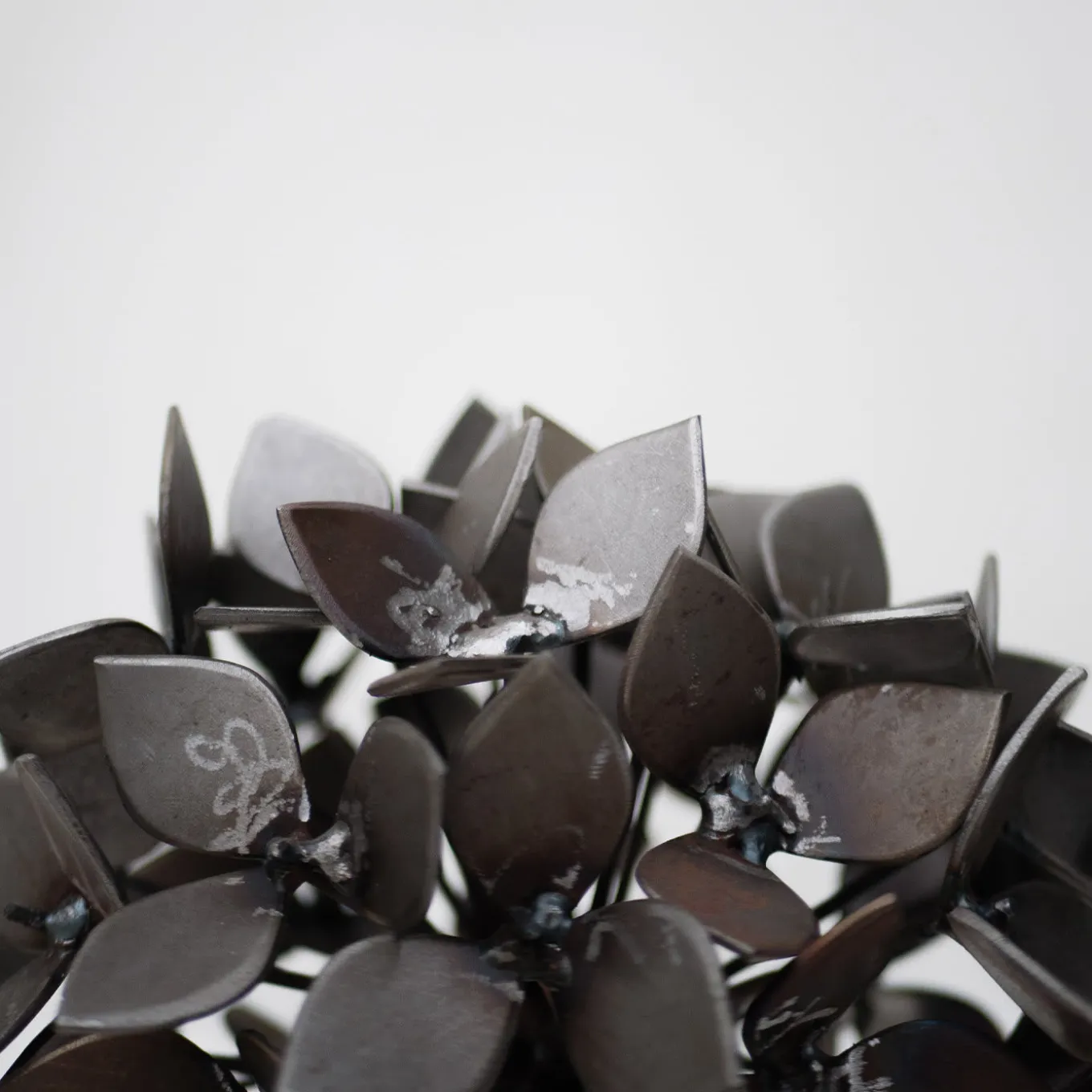 Painstakingly handcrafted from wrought iron, this enthralling sculpture homages the harmonious beauty of hydrangea (“ortesia” in Italia”) flowering heads, their myriad of dainty petals faithfully rendered. The piece, differently from others by the same artist, aims to reproduce the flower’s anatomy, with particular attention focused on the top, which is sustained by a graceful and sinuous stem rising from the wooden base. This refined sculpture is a must-have for any flowers aficionado.