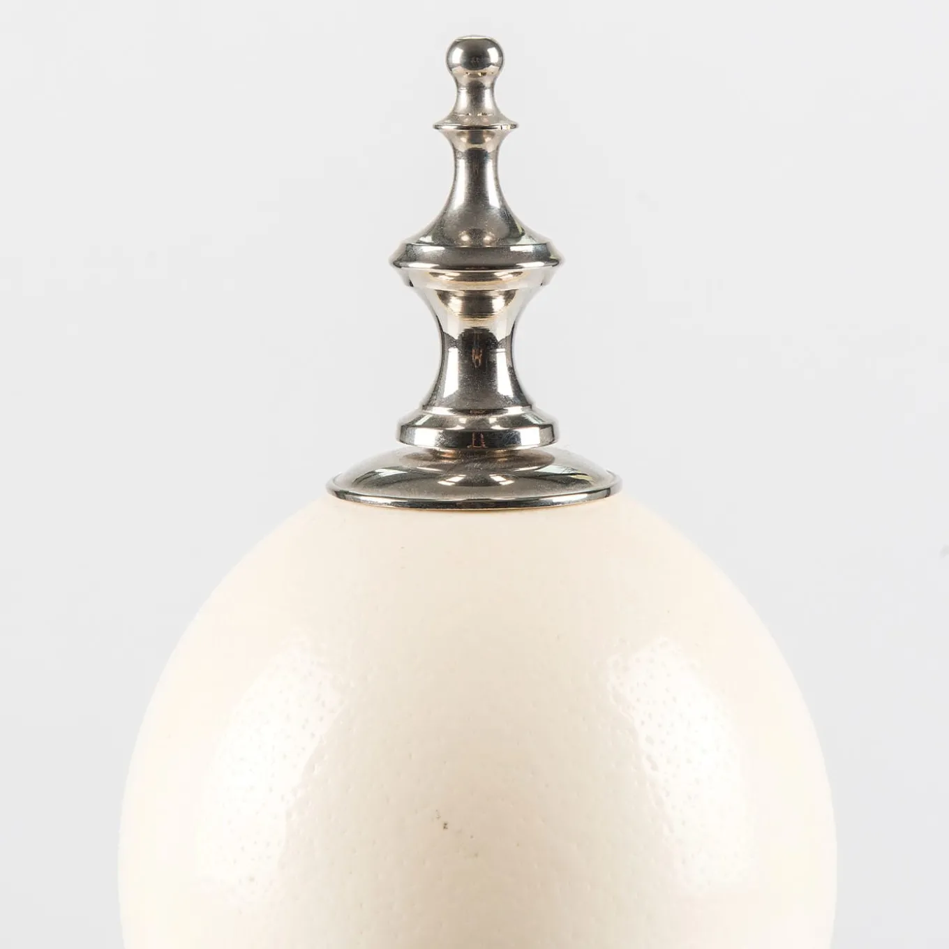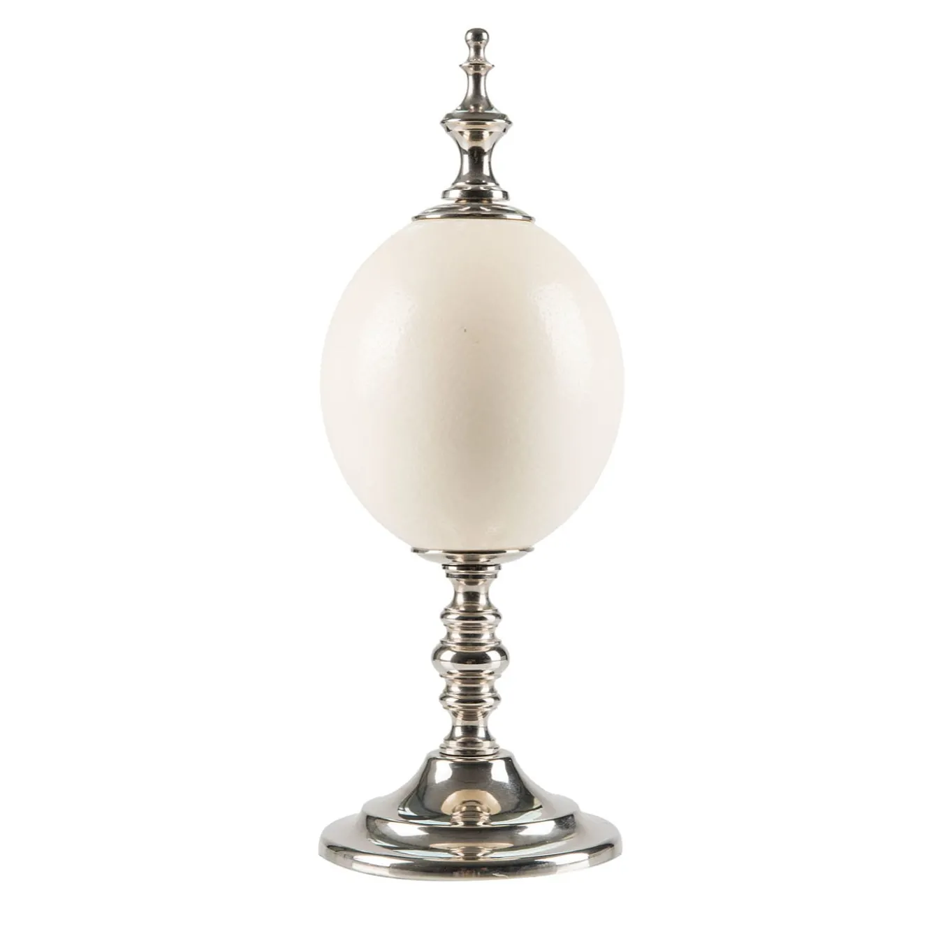 Make a design statement with this captivating ostrich egg display. A genuine ostrich egg, carefully selected for its quality, is expertly mounted on a meticulously crafted, polished nickel brass base. This combination creates a piece that is both elegant and understated, adding a touch of refined style to any room.