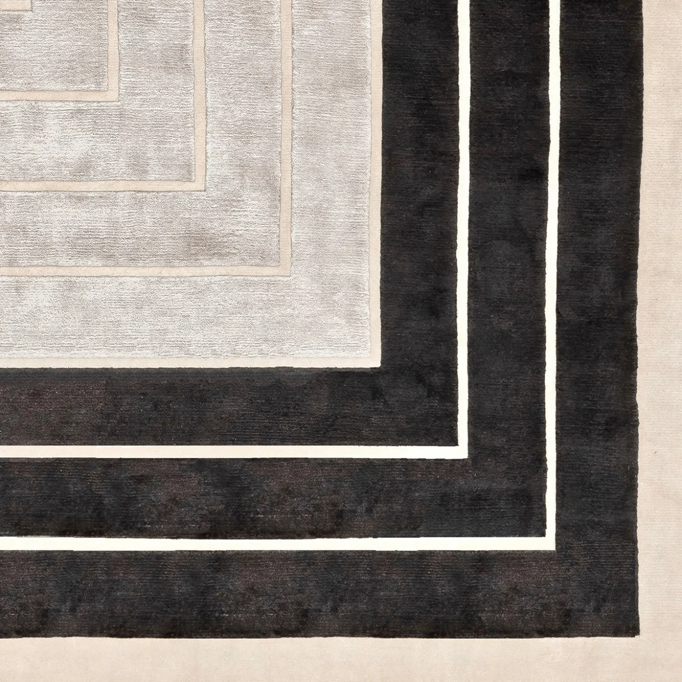 This elegant rug is an exquisite piece of floor decor hand-knotted in Nepal by master craftsmen blending an equal percentage of shimmering silk and soft Himalayan wool. Onto the beige base (H .05cm) is set a captivating design (H .07cm) of concentric frames in black and gray that stop abruptly at different heights inducing the gaze to complete their silhouette. This 152,000 piece can be customized and requested in a stain-resistant variant, please ask the Concierge for options and pricing.