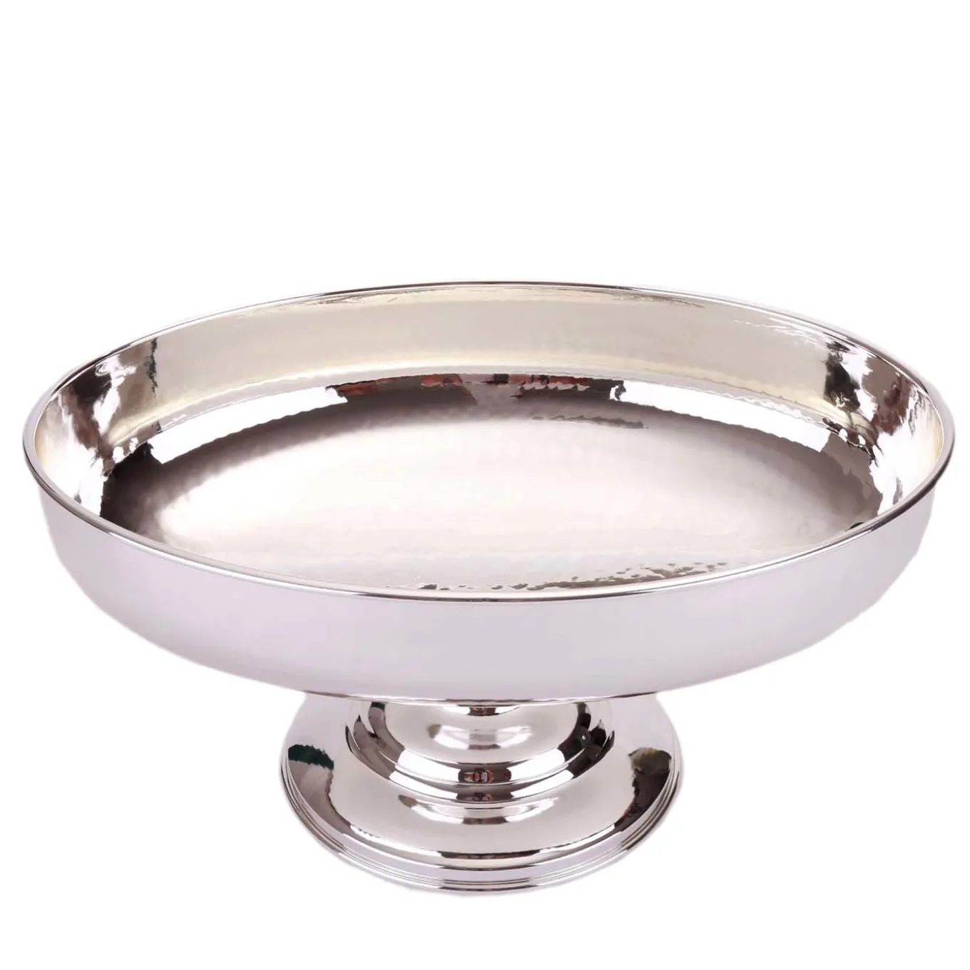 This silver-plated footed bowl will be equally stunning as a centerpiece to hold fruit on a dining table or an entryway console, displaying a bouquet of pastel color blossoms. An elegant luster envelops the entire piece, raised on a round tiered pedestal foot that culminates in the generous oval bowl. Suitable for both modern and classic decors, this bowl boasts a timeless design that will enliven the table both on special and casual occasions.