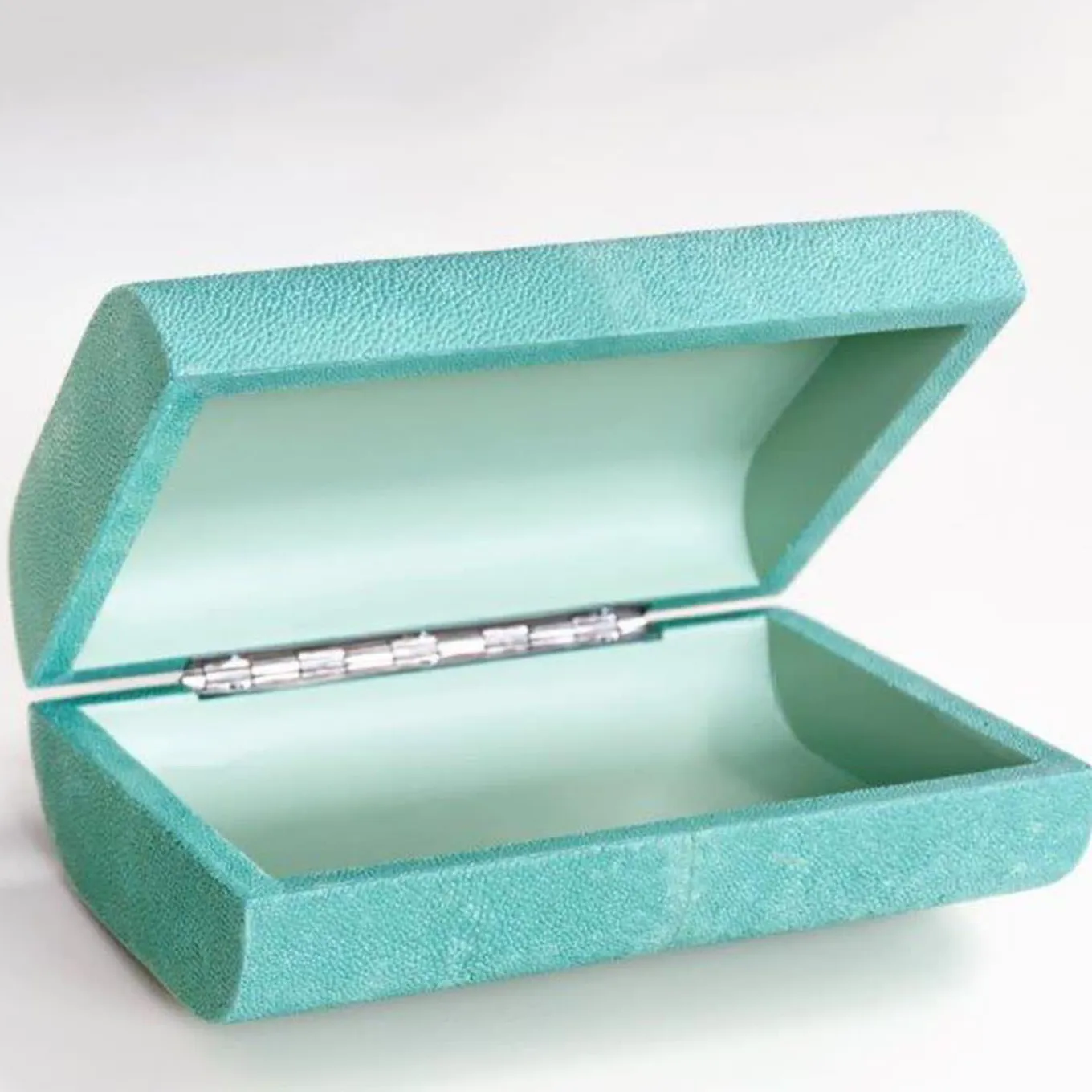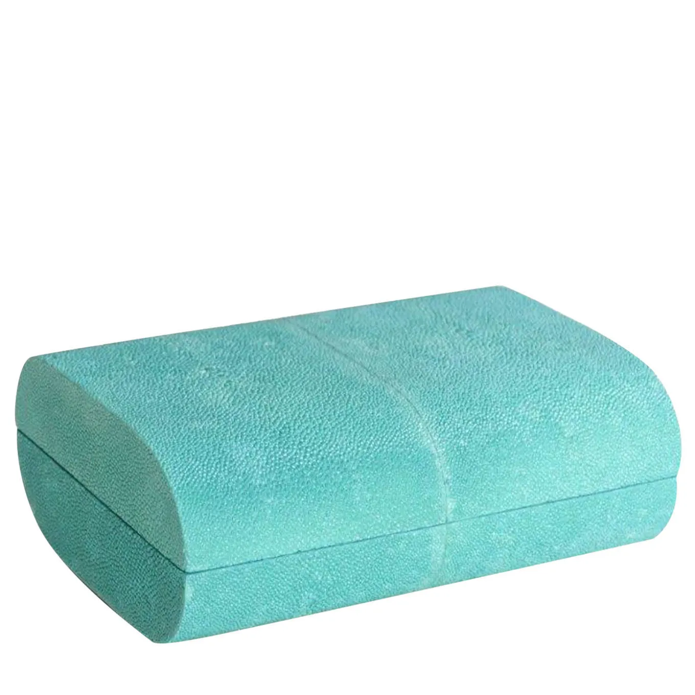 A stylish solution to securely store and showcase precious jewels, this wooden box with oval-cut sides distills fresh opulence. Precious turquoise galuchat leather fully envelops the exterior, while the interior sports a bright color-coordinated lacquer further attesting to the piece’s modern character. Seductive to the touch thanks to its intriguing natural texture, each piece is entirely unique due to their handmade production.