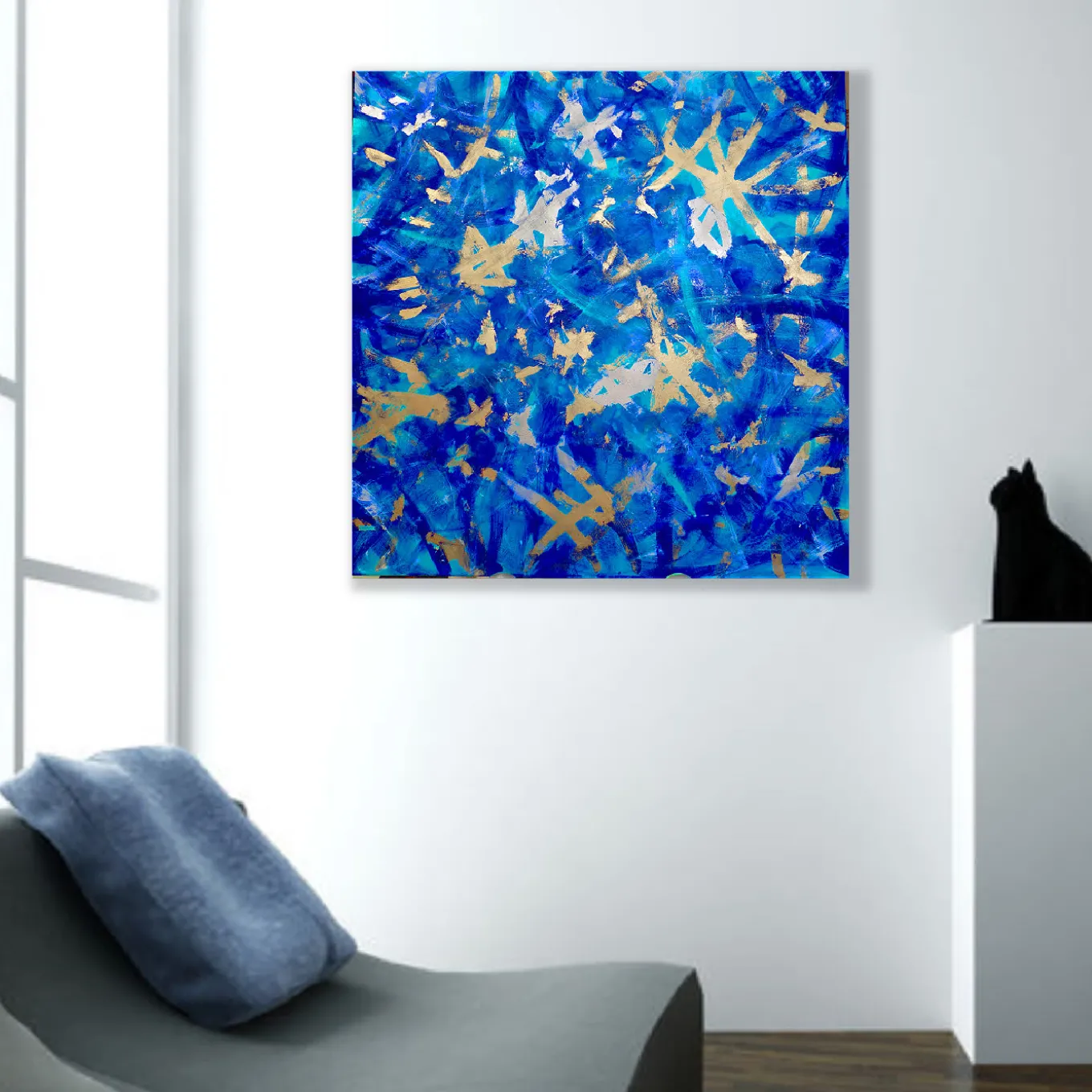 Cobalt blue hues of acrylic paint are powerfully brushed on this superb expressionist canvas, enriched with gold and silver leaves for a refined accent of unique sophistication. Timeless and dynamic, this singular painting can be customized in size upon request, with a slight change in prize and features. It can also be requested with or without a frame at an additional cost, please ask the Concierge for details.