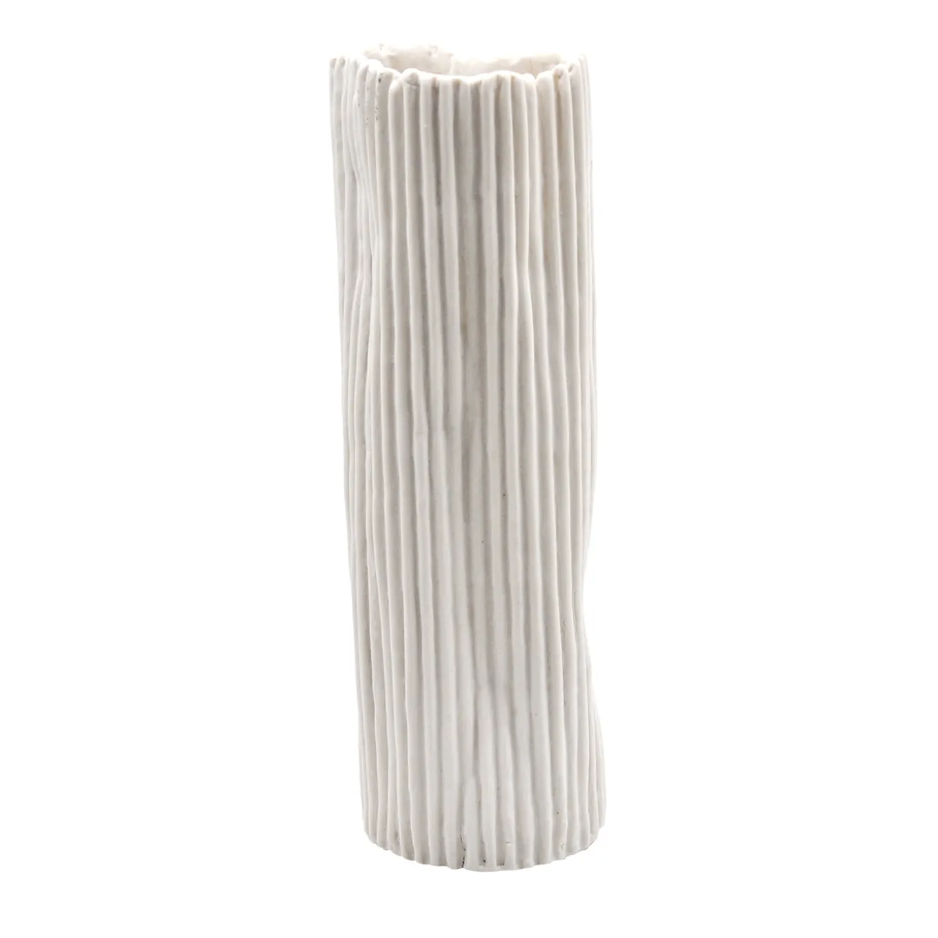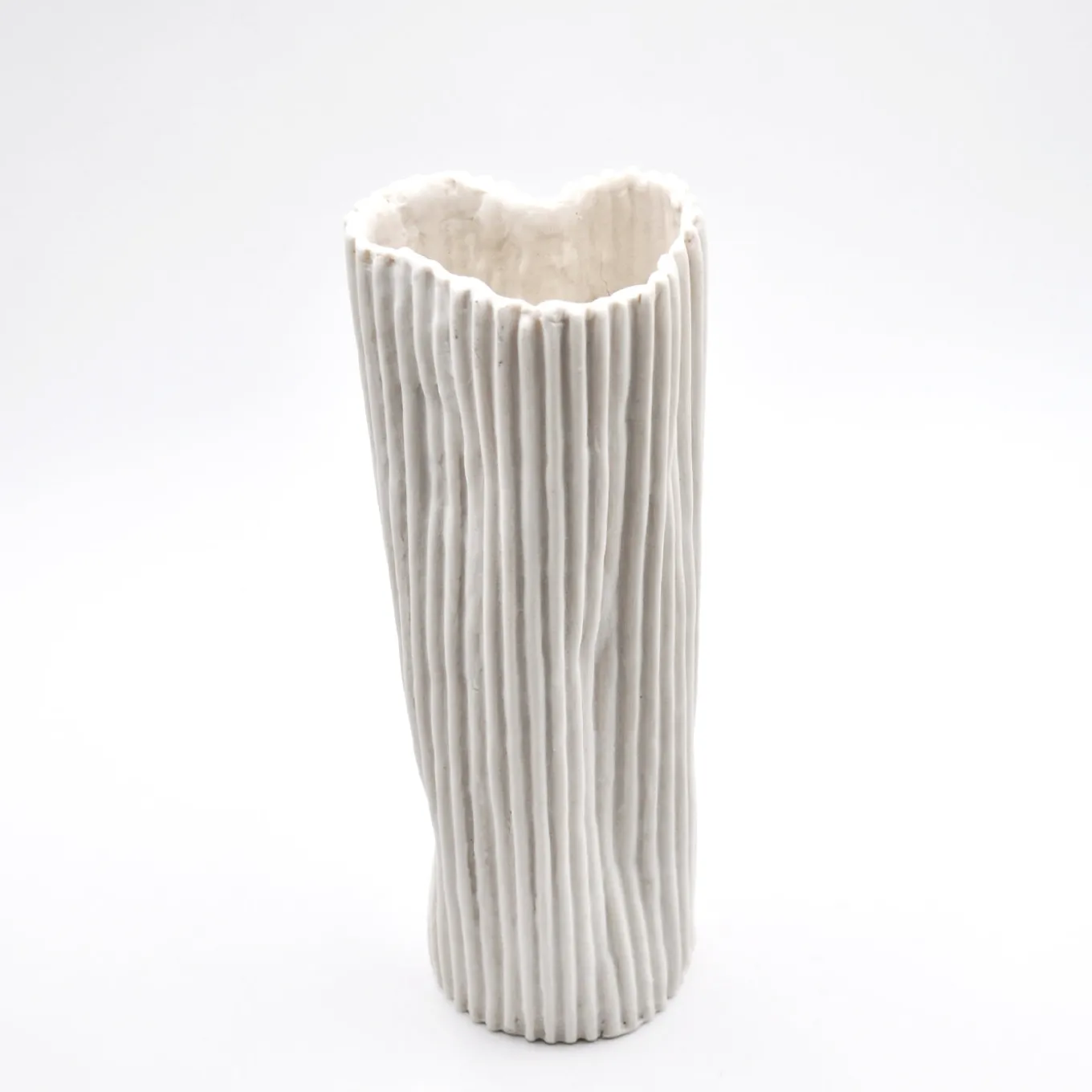 The Paesaggio 21 vase by nino basso features an essential design with a refined white texture and vertical wave patterns in relief. Created using a unique technique that applies porcelain and natural fibers onto a single-use mold, its surface reveals organic undulations formed during firing, making each piece one of a kind. Its minimalist and sophisticated style complements contemporary spaces while including packaging, authenticity certificate, and care instructions.