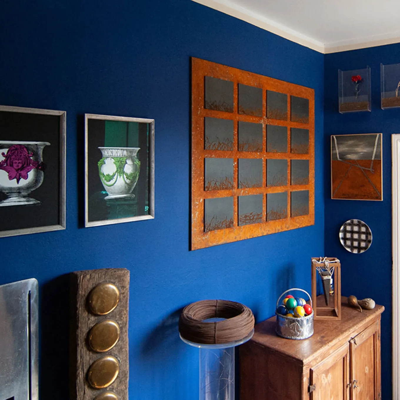 Paesaggio in Sedicesimi is an artwork made of corten iron: once again it is repetition and geometric order, which impose themselves in the construction of the work. In this set of small landscapes, however, the apparent rigidity of the geometry is balanced by the darting and unpredictable sign of the iron that interrupts the mechanical cadence of the starting point. The idea of the sixteenths is an homage to the work of the graphic artist.