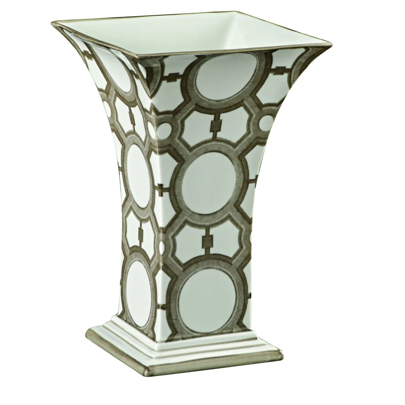 An exquisite display for floral arrangements as well as a stunning statement piece on its own, this spectacular vase will make for an exclusive addition to a personal art and design collection. Enhanced with a gorgeous dove-gray decor of classic inspiration, its flared and polished shape is superbly handmade of first-rate white porcelain.