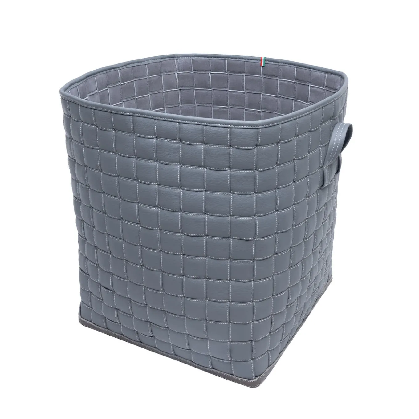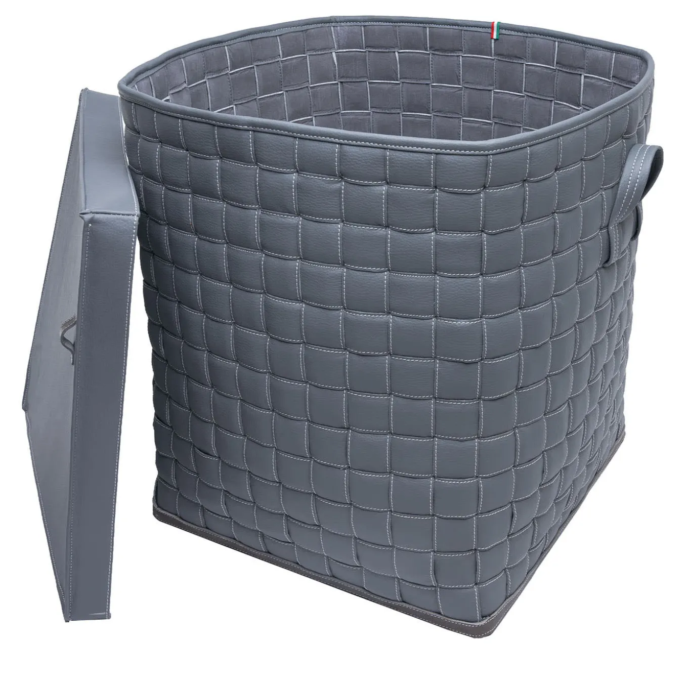 Sartorial flair and practicality unexpectedly coexist in this exclusive laundry basket. Obtained from the careful knotting of gray faux leather bands, its reticular design is intriguing to both eyes and touch, while the coordinated lid and loose handles flaunt a quieter look. Tiny feet fitted to its rigid underside protect it from humidity and dirt. Please contact the Concierge for available color and size variants.