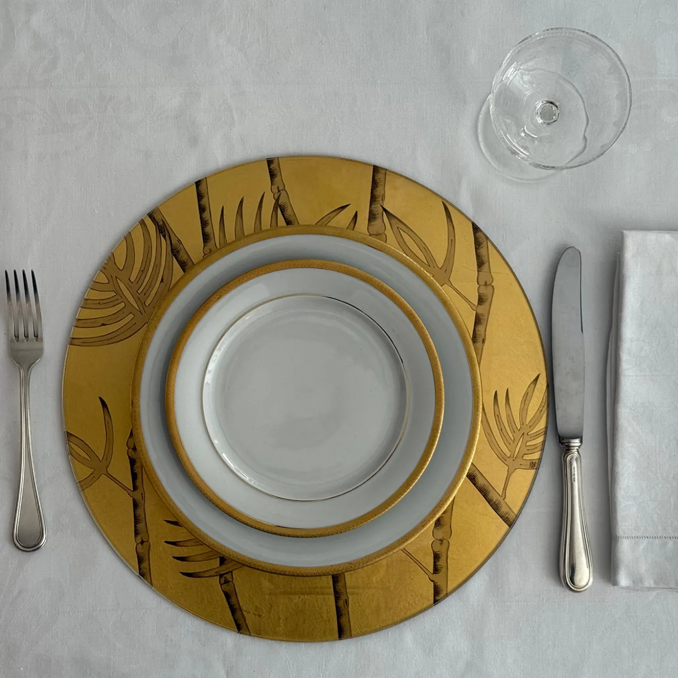 This piece is part of the “Pappagalli” collection within the iconic “Oro su Vetro” series. Crafted with a meticulous artisanal process, it features a delicate design of palm leaves rendered in graphite over a surface fully coated with 24k gold leaf. This decorative plate can be used to enhance a luxurious table setting or displayed as a sculptural art piece, offering a dynamic interplay of light and reflections that changes with its environment.