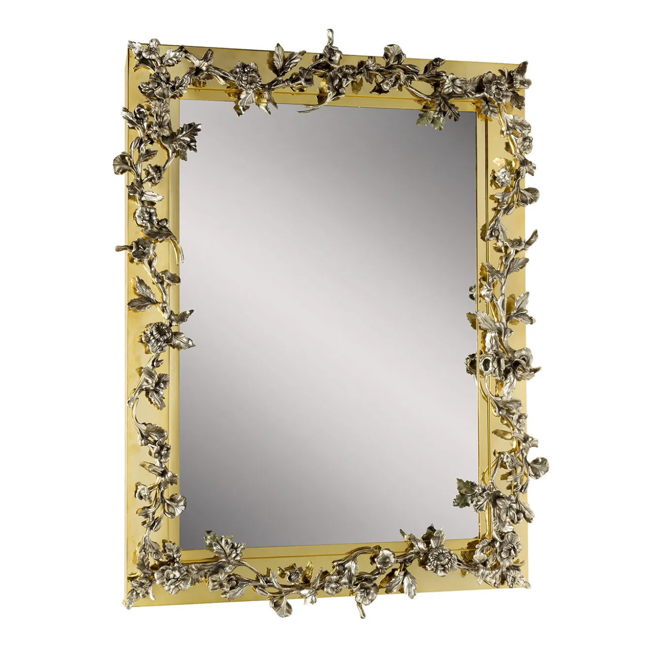 This rectangular wall mirror from the Luxury Foundry collection features a natural brass frame adorned with intricate bronze flower appliqués. The floral designs in bronze casting create a striking contrast with the smooth metallic frame, blending classic craftsmanship with modern luxury. Its medium size makes it a refined decorative element suitable for enhancing the elegance of any interior space.