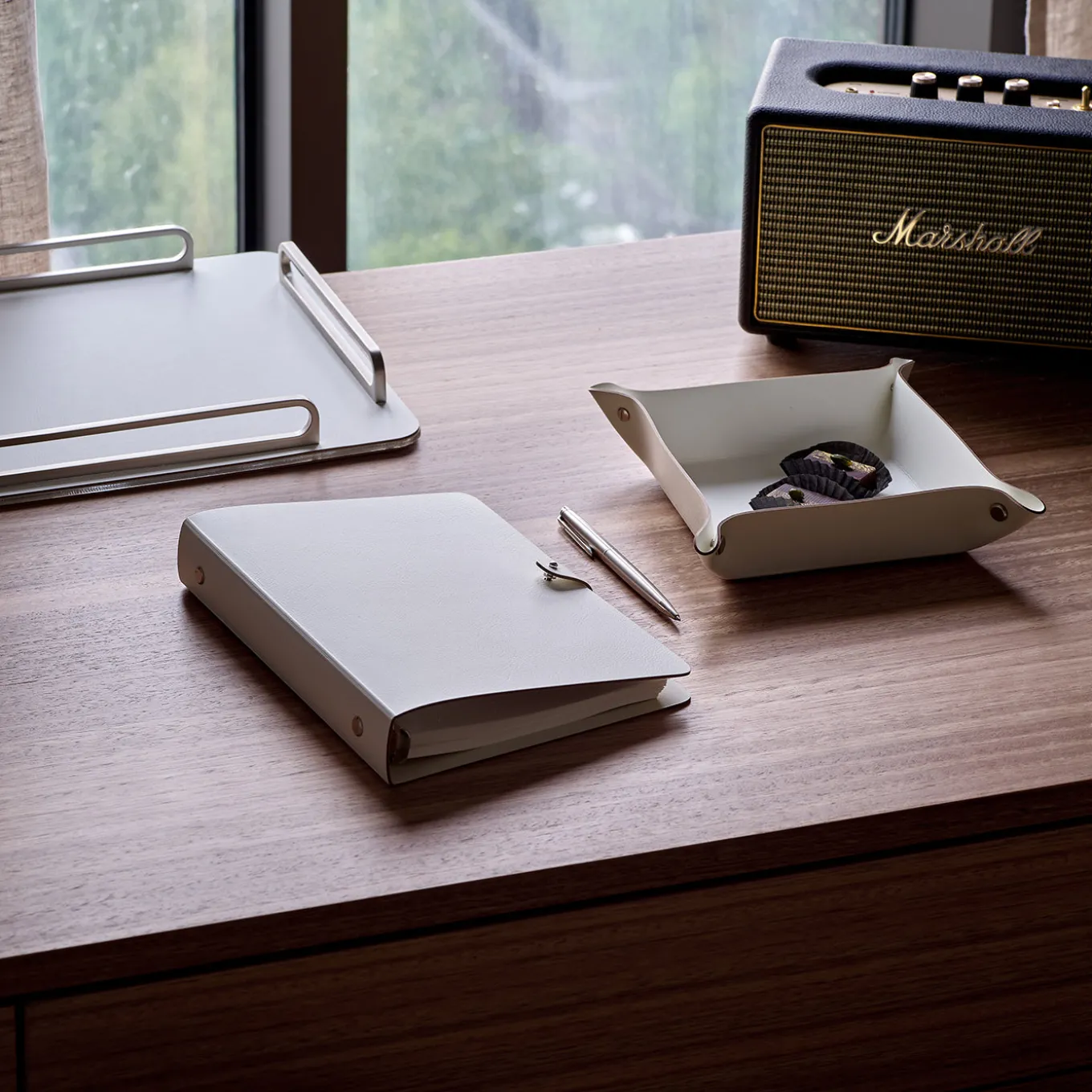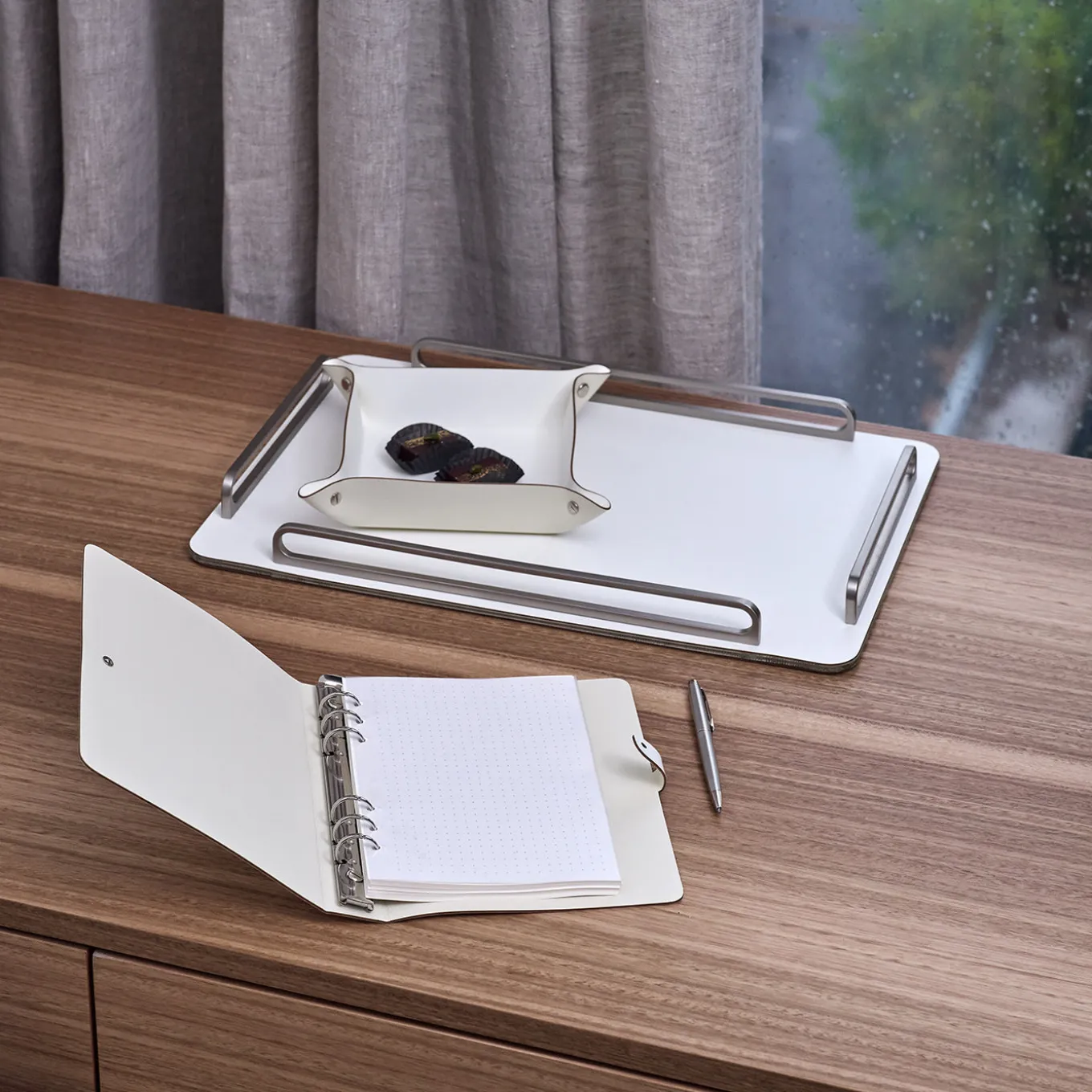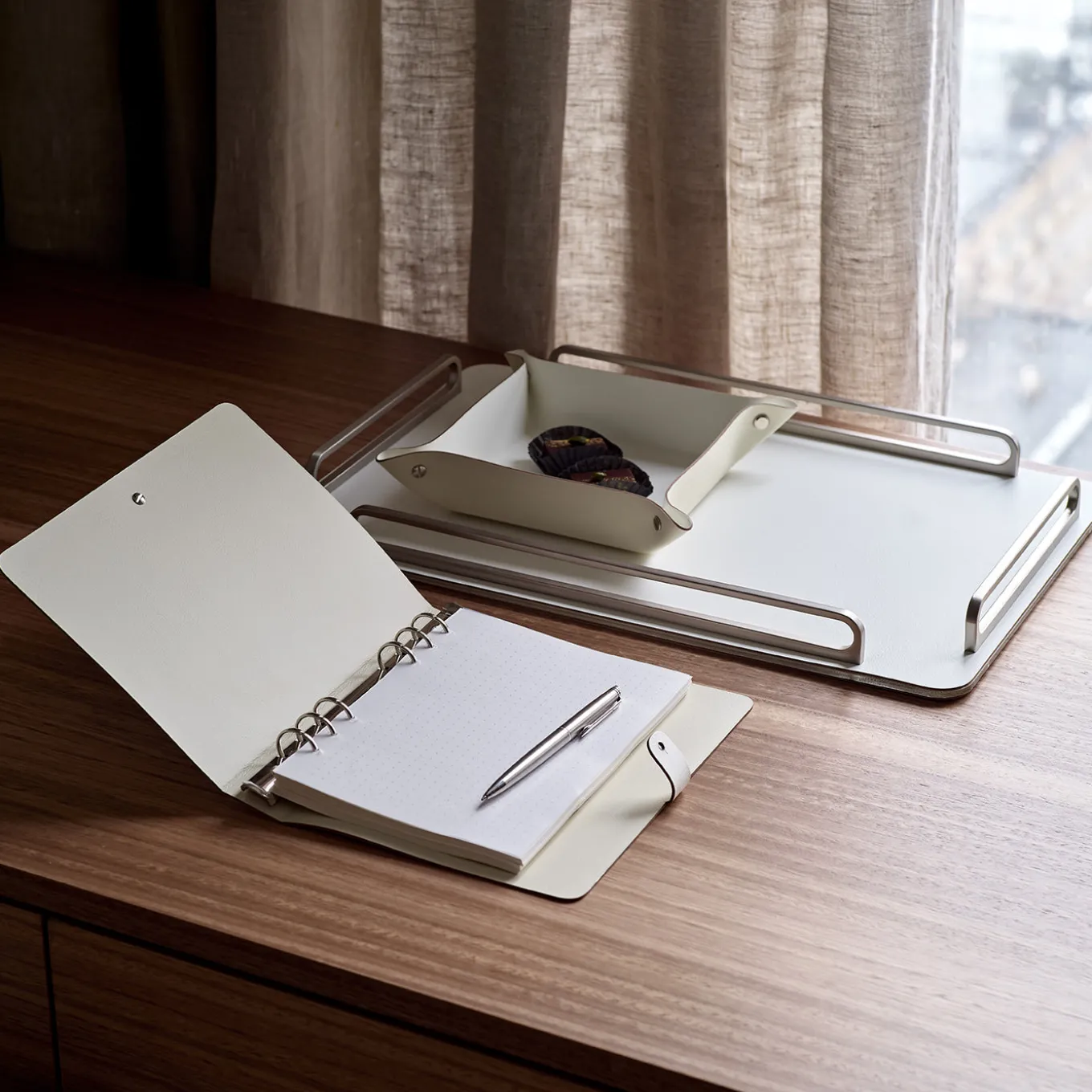 A practical vide poche designed to keep small desk items such as paper clips, coins, and keys organized and easily accessible. Featuring a panna cotta and white color scheme, it offers a sleek, minimalist style. The folded corners are secured with studs, adding subtle detailing while maintaining a clean silhouette. Designed by Ekaterina Borovkova, this piece combines functionality with understated elegance for any workspace.