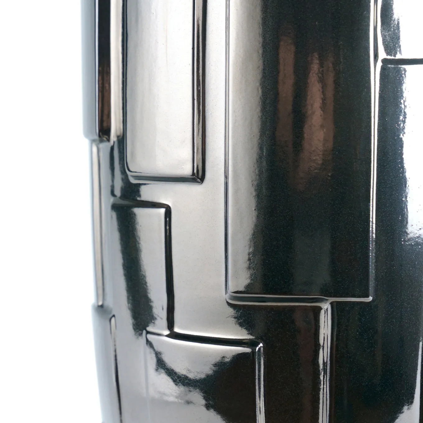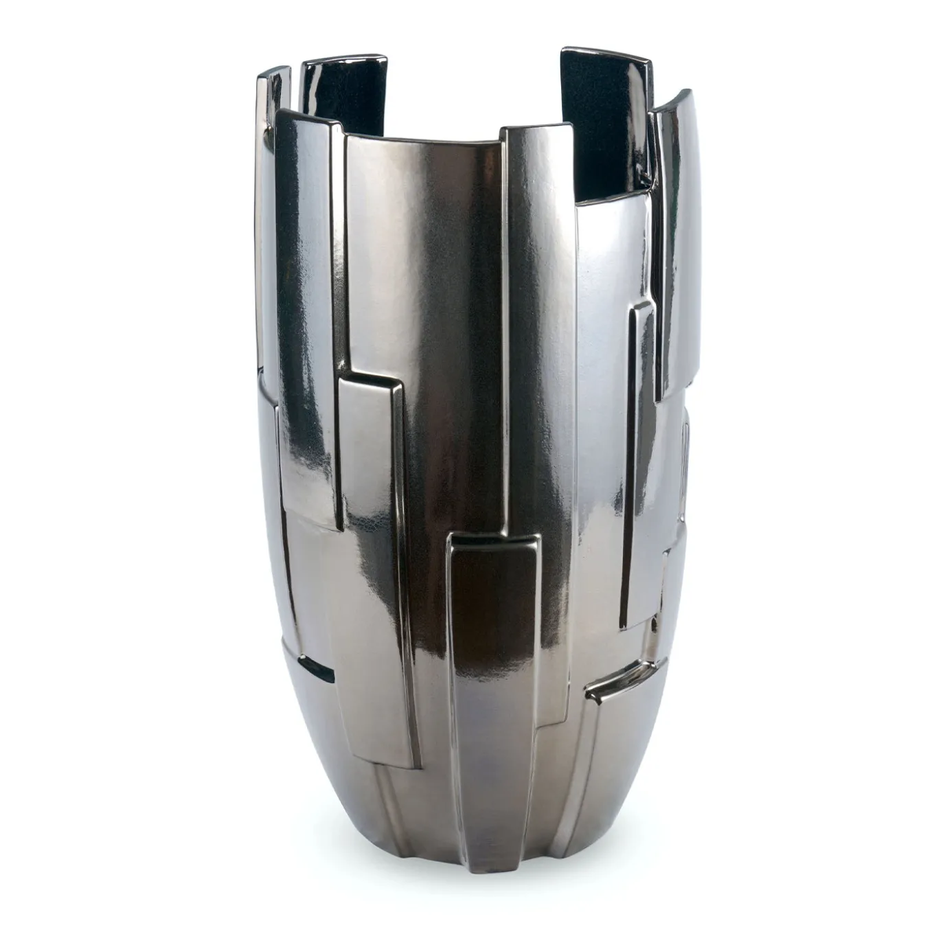 The Panoplia vase features a dynamic sculptural design with interlocking voids and overlapping solids that shift with perspective. Its high-temperature enamel finish creates a mirror-like titanium sheen, lending a metallic, armor-inspired aesthetic. This bold yet refined piece balances strength and delicacy, making it a distinctive decorative accent. Each vase exhibits subtle variations that reflect the artisanal craftsmanship involved.