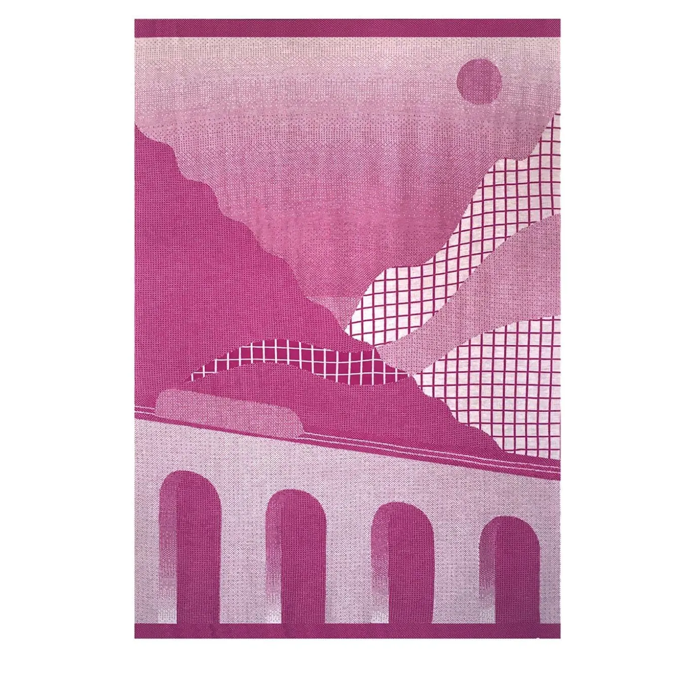 Featuring the abstract depiction of a bridge and mountains, this 100% Merino wool throw blanket is woven in soft and darker shades of mauve weaving for a lovely piece that can be used as a tapestry or used for extra warmth. Serena Confalonieri, designer of this piece, was inspired by real life stories in creating this unique blanket.