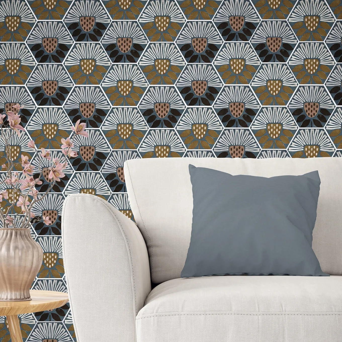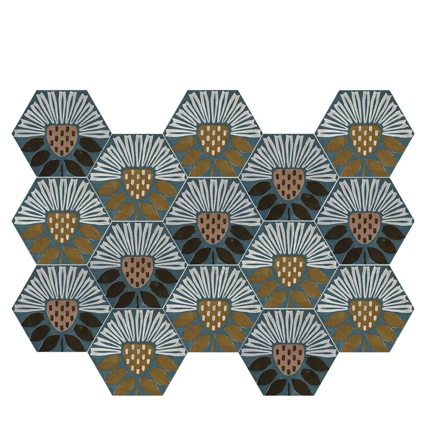 Drawing attention with its bold contrast and distinct hexagonal form, the Peace&Love ceramic tile composition brings vintage charm to kitchens, bathrooms, or entryways. Hand-painted with vibrant white petals and warm earth tones against a matte gray background, these tiles create a dynamic visual impact. Each square meter includes 31 star and 31 cross-shaped tiles, offering versatile design options. Price is per square meter. Please contact the Concierge for further technical specifications.