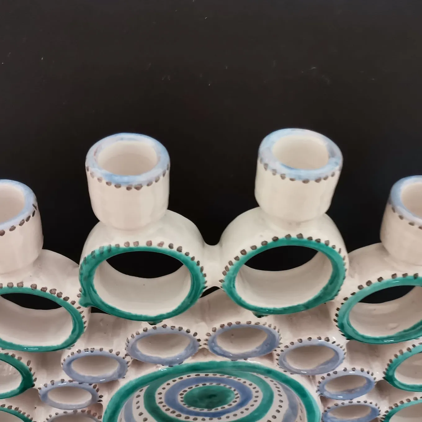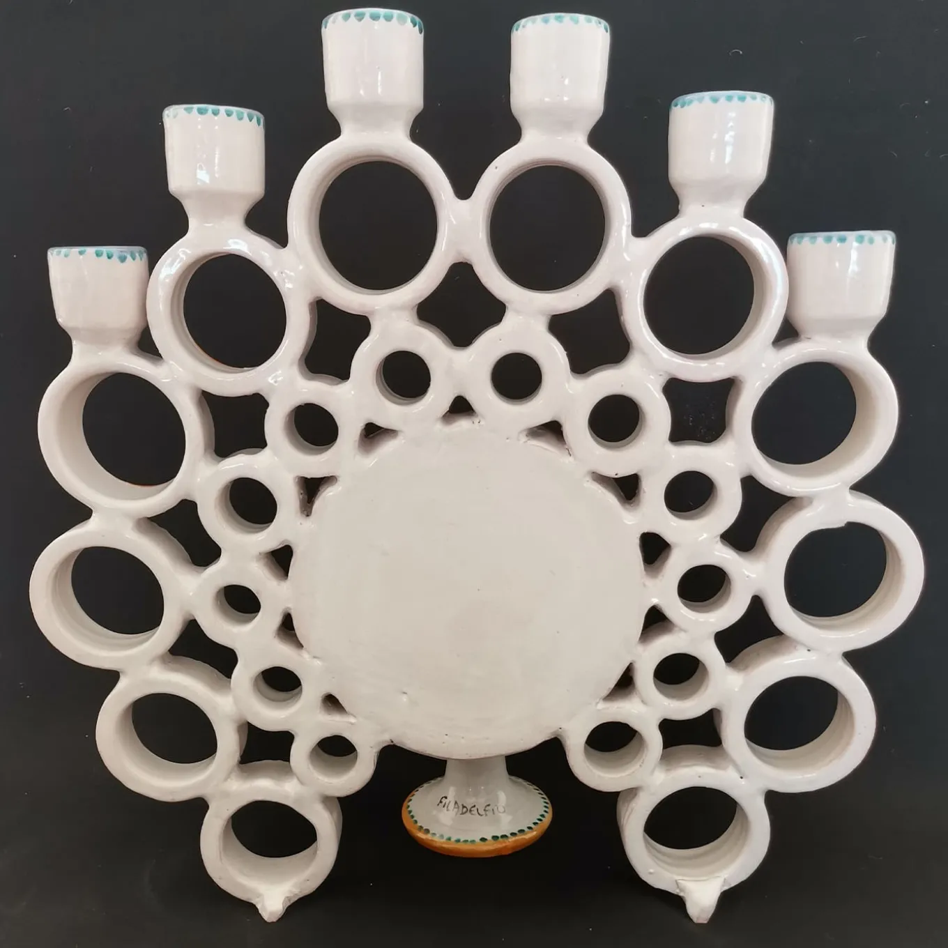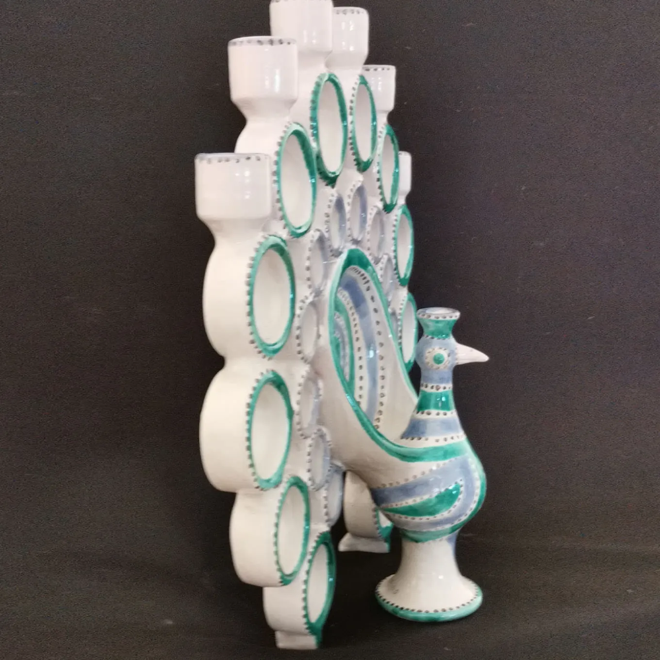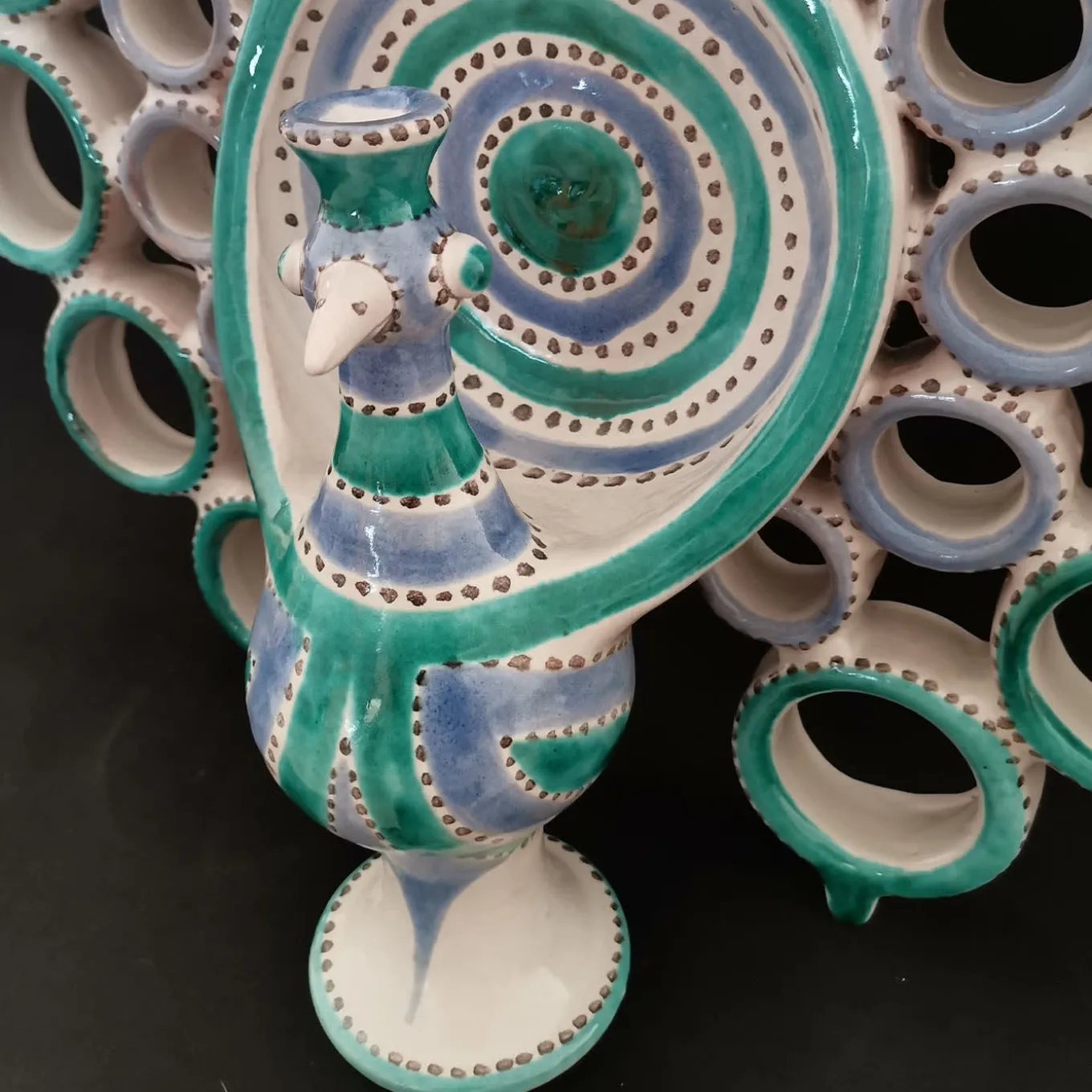 Eccentric and colorful, this ceramic candelabra strikes with its silhouette playfully recreating an open-tail peacock. A masterful artisan process ranging from turning to decoration ensures the entire uniqueness of every single piece, which hypnotizes with its radially-arranged turned rings enhanced by vibrant turquoise and azure traits.
