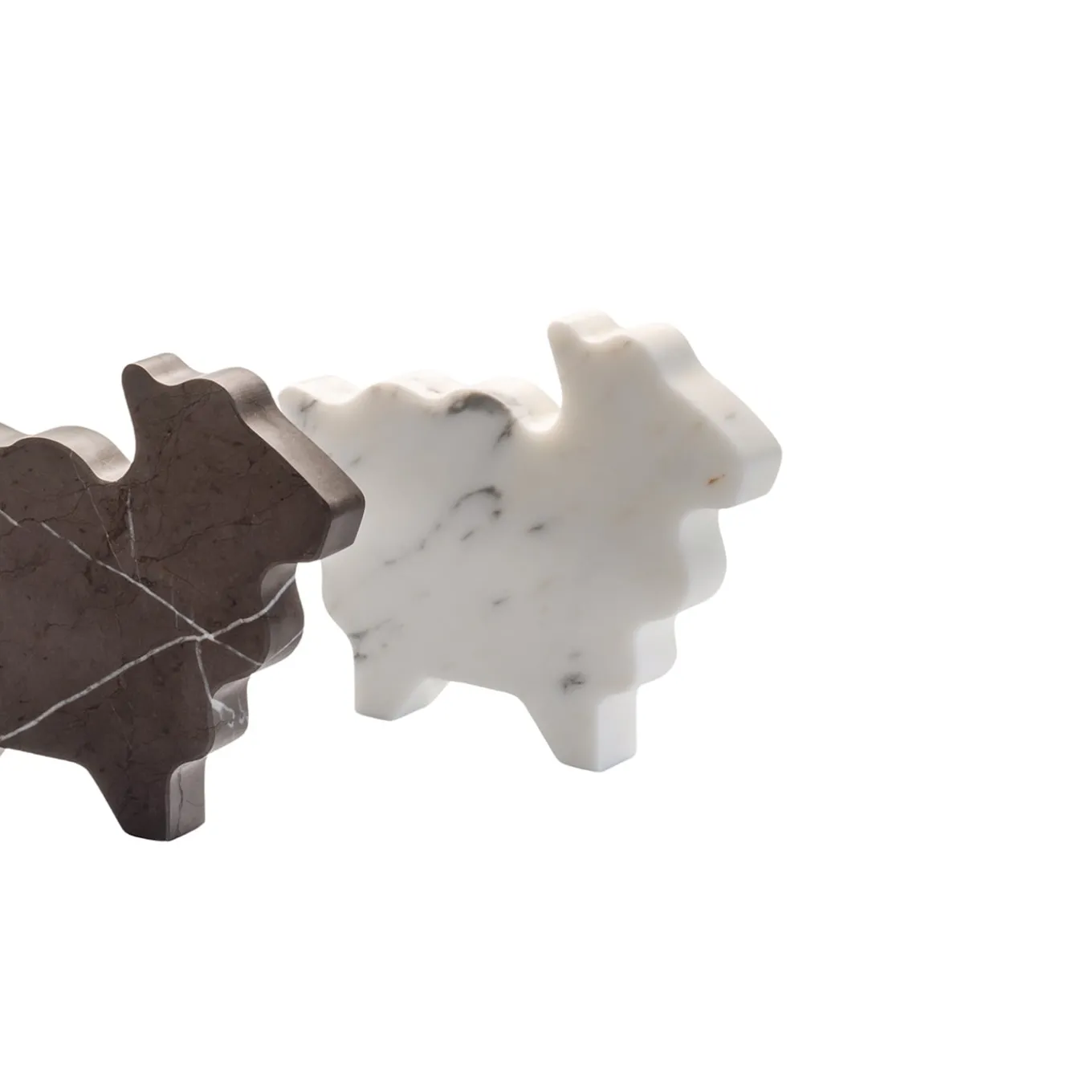 A small sheep in white Carrara marble, this design by Alessandra Grasso belongs to the Factory series of animal-shaped statuettes and paperweights. Deftly handcrafted and finished by hand, it will make a singular and lively accent on a contemporary console, writing desk, or even dining table as a nameplate. Available in Graphite marble and in a larger version upon request to the Concierge.