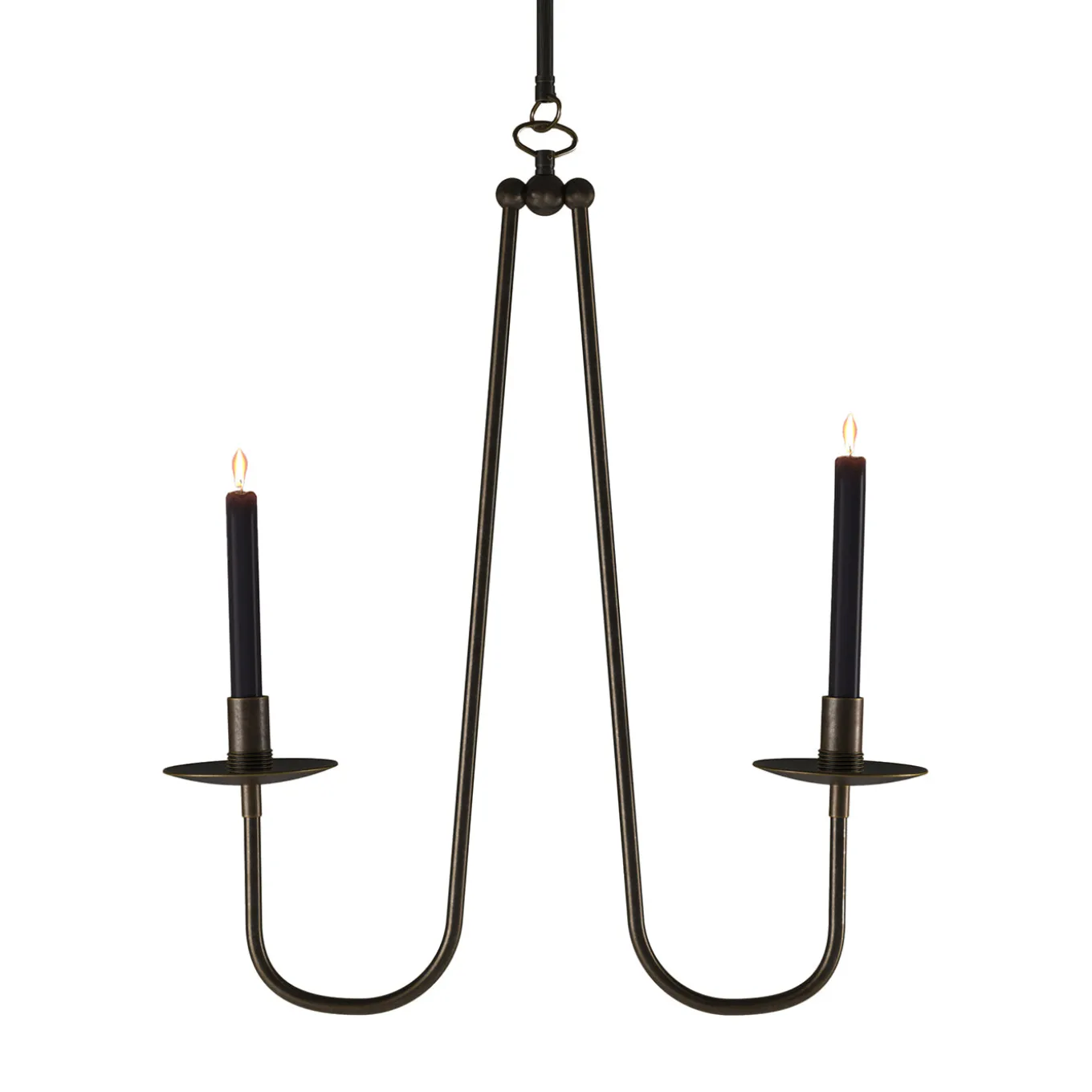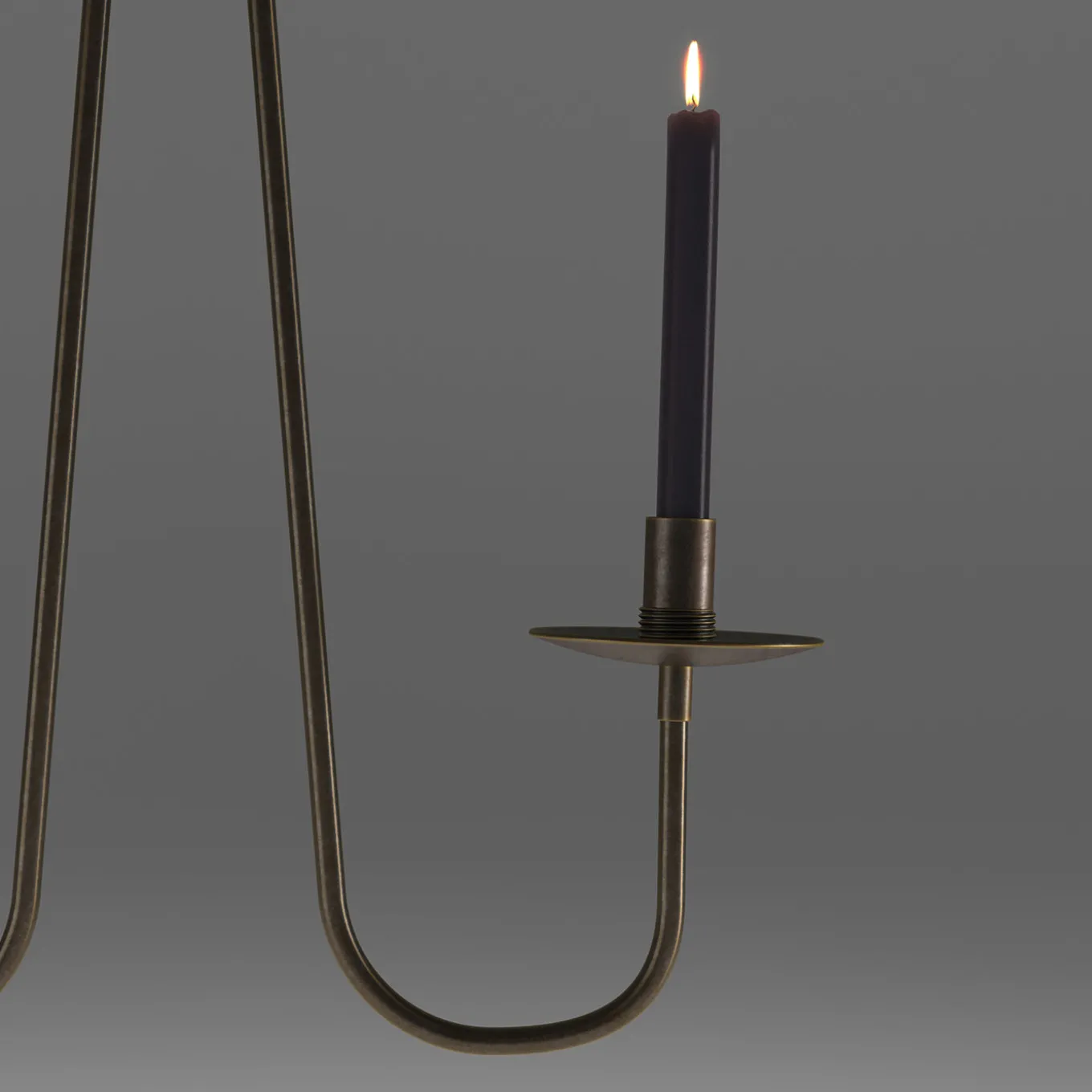 Penombra double-arm candelabrum features a dark brown natural brass finish with two rounded candle plates supported by a rigid vertical rod. Designed for ceiling mounting, it offers flexibility with either a hook or a round ceiling base for secure fixation. The minimalist silhouette and durable structure make it suitable for elegant ambient lighting in various interior settings. Candles are not included.