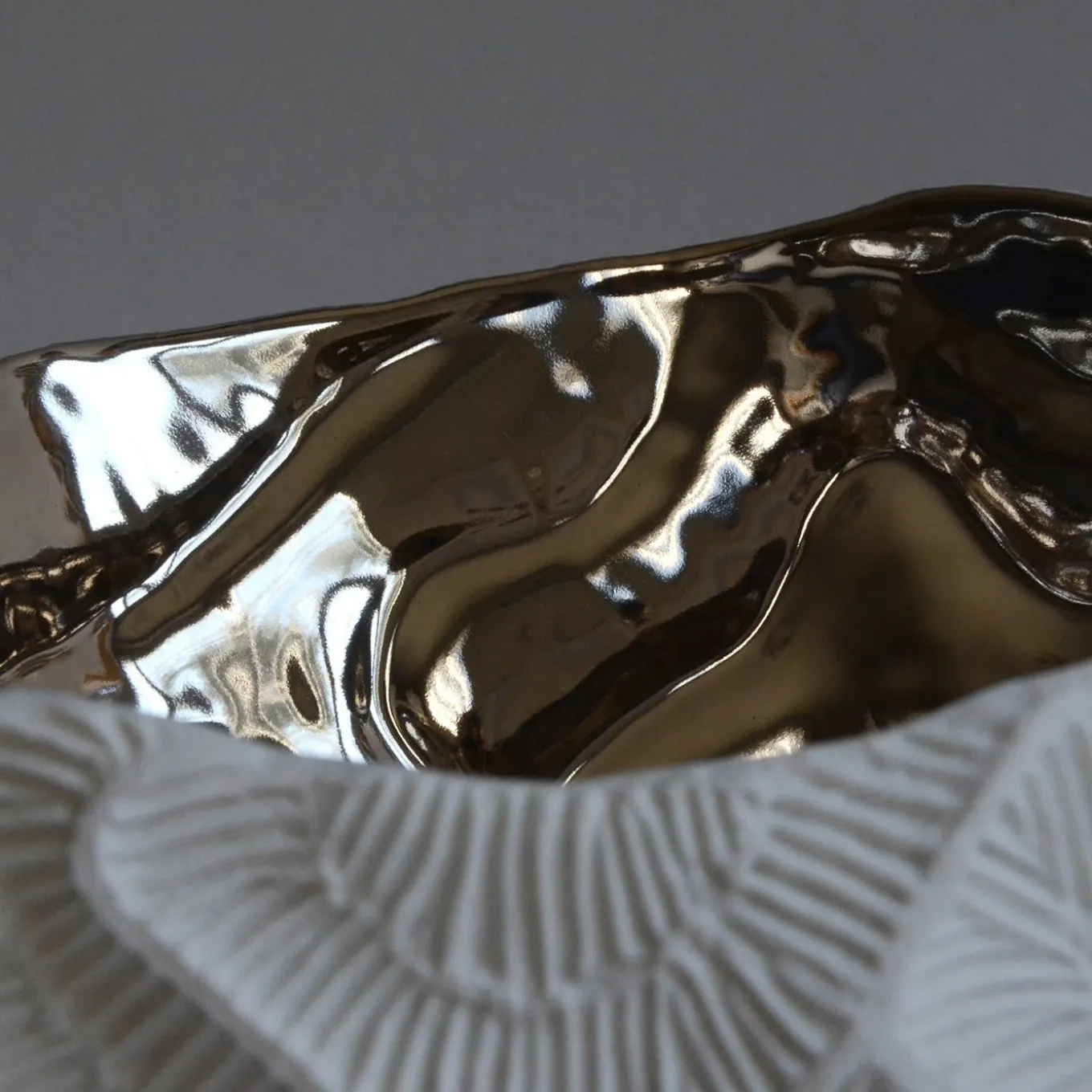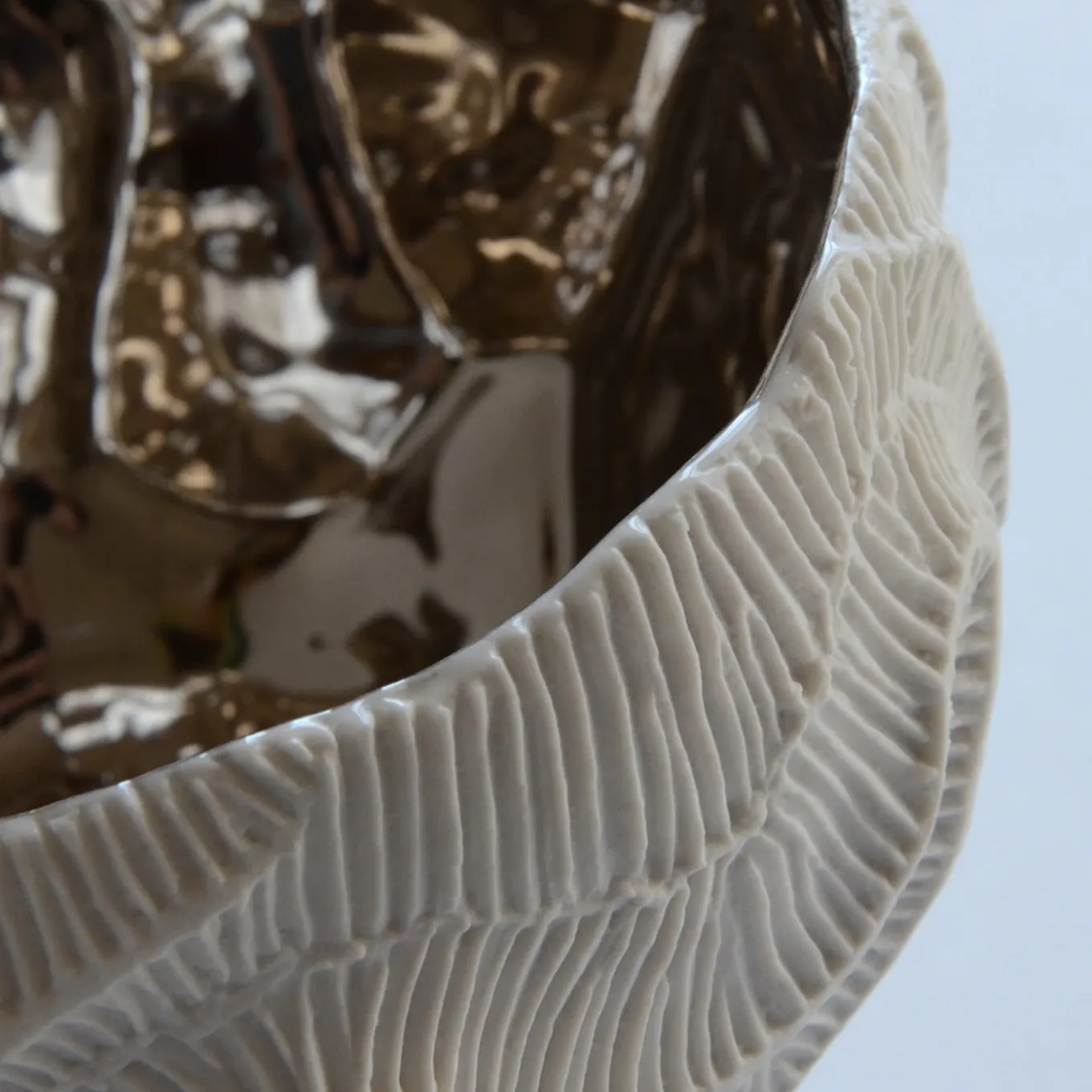 Drawing inspiration from madrepore fossils, this oval-shaped bowl is a captivating sculptural object. Long, sinuous ridges characterize the shell-white unglazed porcelain exterior, their tactile quality achieved with the “biscuit” technique. The visually stunning interior is handmade using 22kt platinum, the metallic finish contrasting with the stark white exterior. The interplay between contrasting colors and sinuous forms makes for a striking composition that will add a touch of contemporary elegance to any decor.