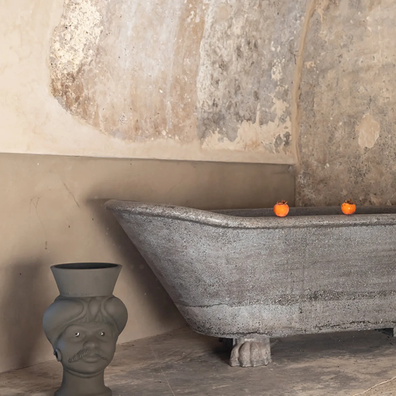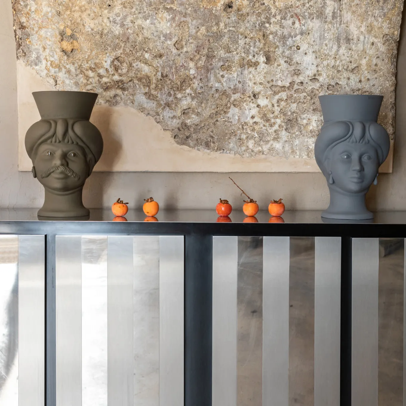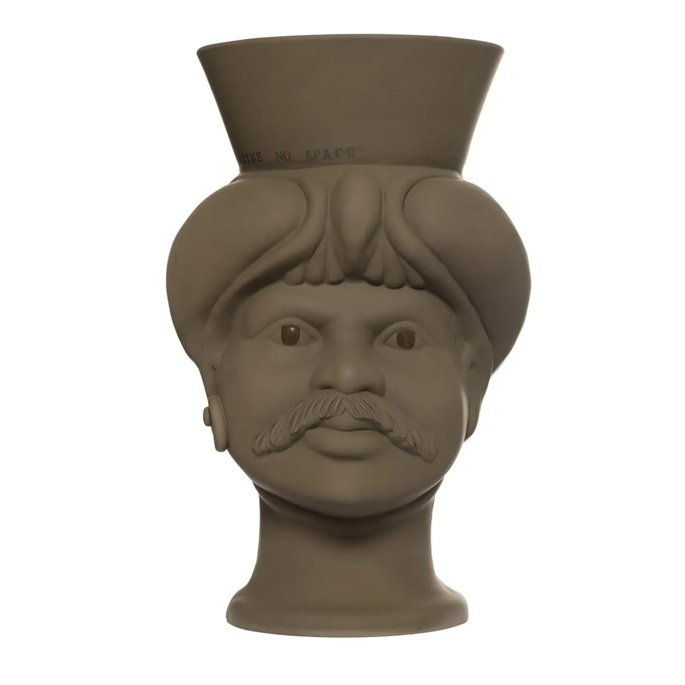 This anthropomorphic clay vase is made entirely by hand and painted with an opaque monochromatic tint, of a particular green. Only the eyes of the figure are glazed to make them stand out, emphasizing the look. The piece is inspired by the ancient Sicilian legends of love and revenge between a Moor and a young girl. It can be customized on request in any color. Please, ask the Concierge for further details. The vase cannot be filled with water.