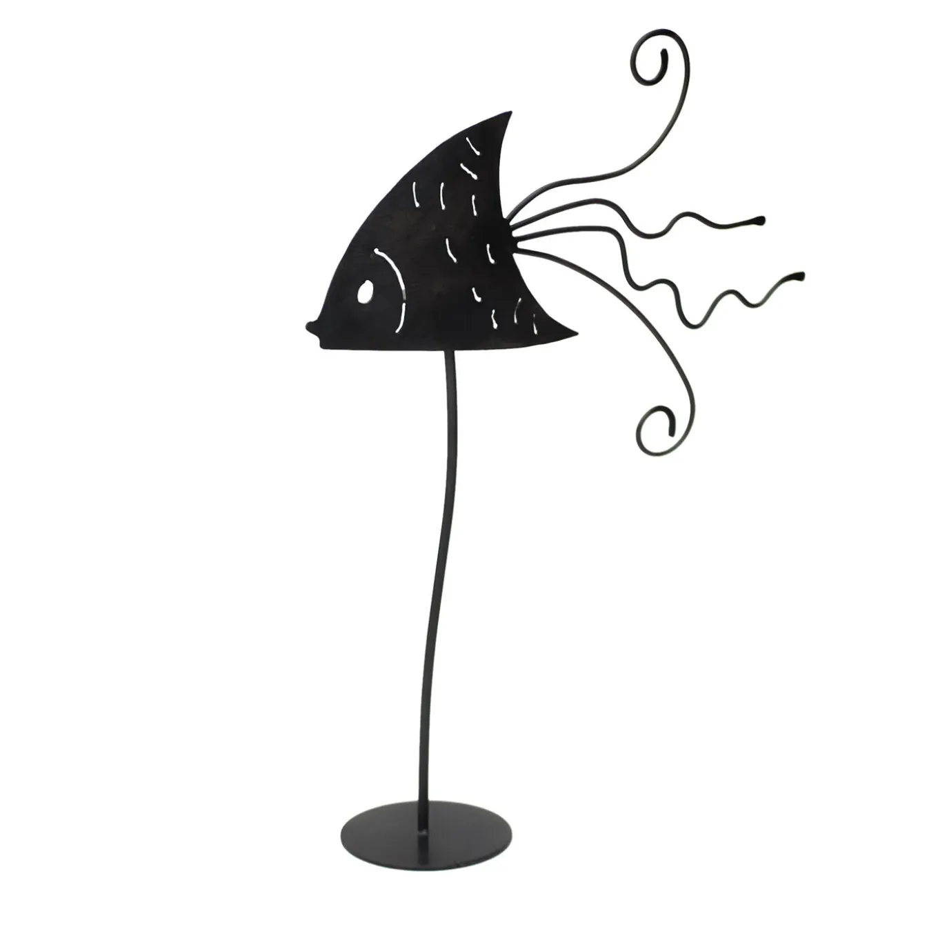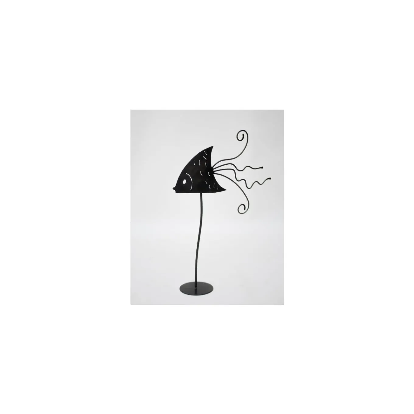 The playful yet elegant personality marking this iron sculpture makes its display endlessly versatile to fit in any contemporary setting. Minutely handcrafted and enriched by a burnished finish, it comprises a round base from which rises the slightly sinuous stem sustaining the fish-shaped element, which has a whimsical, arrow-shaped body enlivened by pierces to define its physical features and by an enthralling tail consisting of twisted, curved rods. A protective layer of oil seals the piece.
