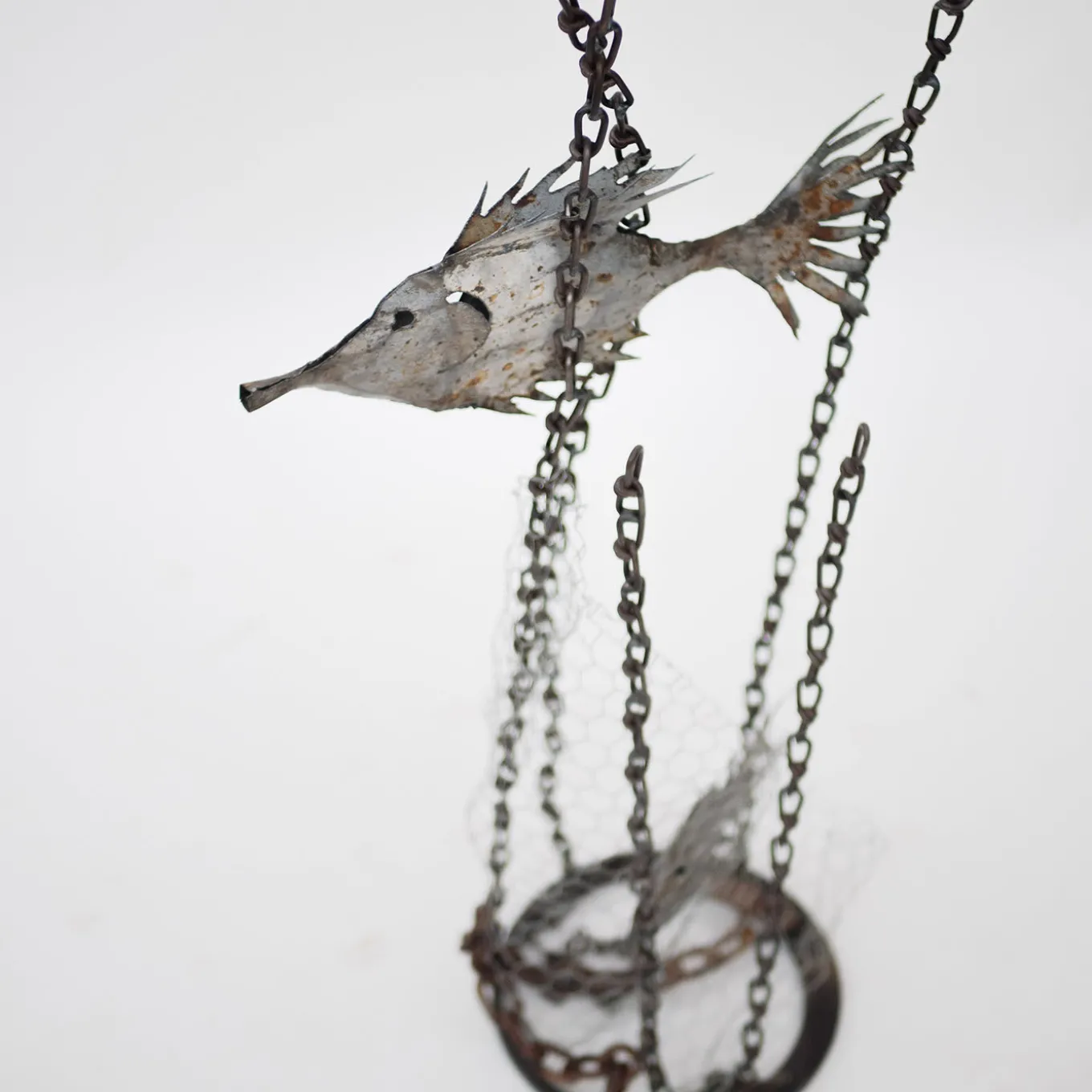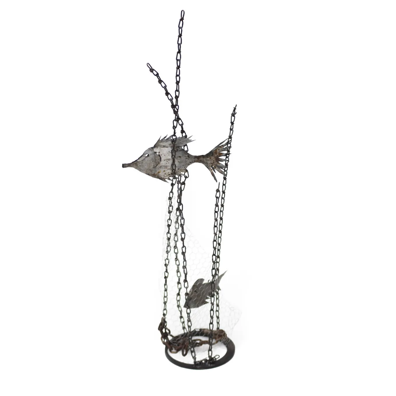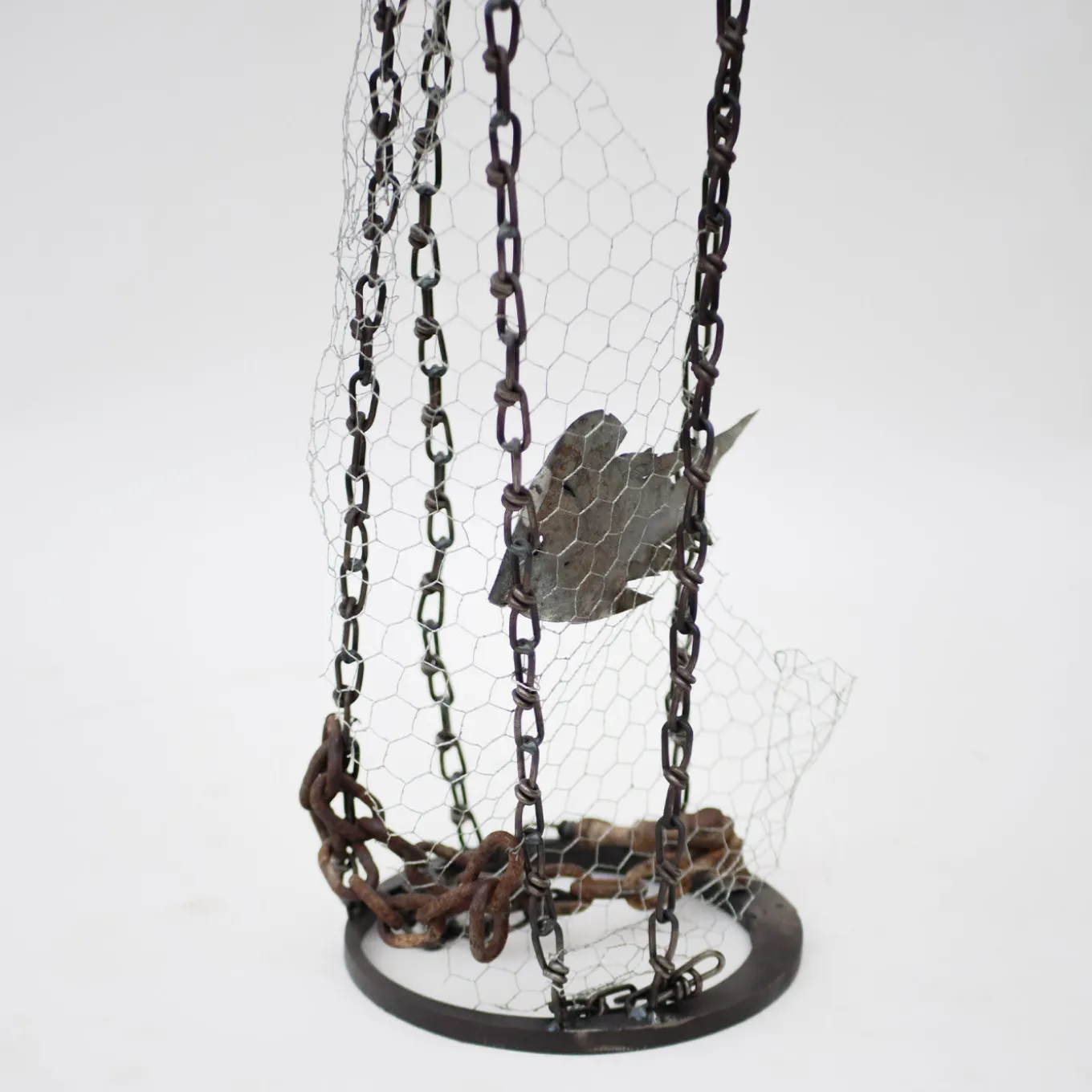 This sculpture – deftly handcrafted from iron and from retrieved components coherently with the ecologist theme – aims to catalyze the observer’s attention on what is underwater, far from sight. The damage human exploitation is causing to marine fauna is exemplified by the chains and nets, dancing with the fish a macabre pas de deux. Rendered in exquisite detail, the fish is showcased in a defenseless status, trapped in its own habitat. An objet d’art with a conscious flair.