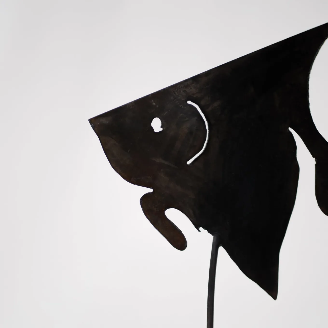 Exuding contemporary flair, this statement-making design in burnished wrought iron is equally stunning as a purely decorative piece or as candleholder. The elongated stem rising from the square base functions as support for the fish, whose vaguely triangular body inspired the sculpture’s name. The physical traits are masterfully rendered by the artist by deftly shaping its profile and creating specific holes to add the necessary depth and expressiveness to the subject.