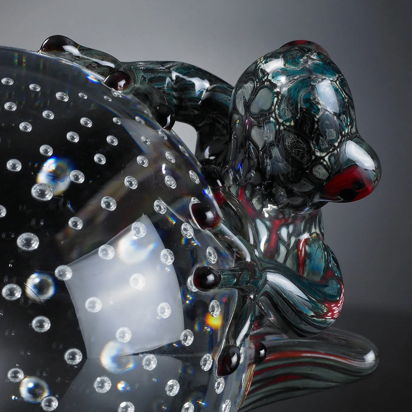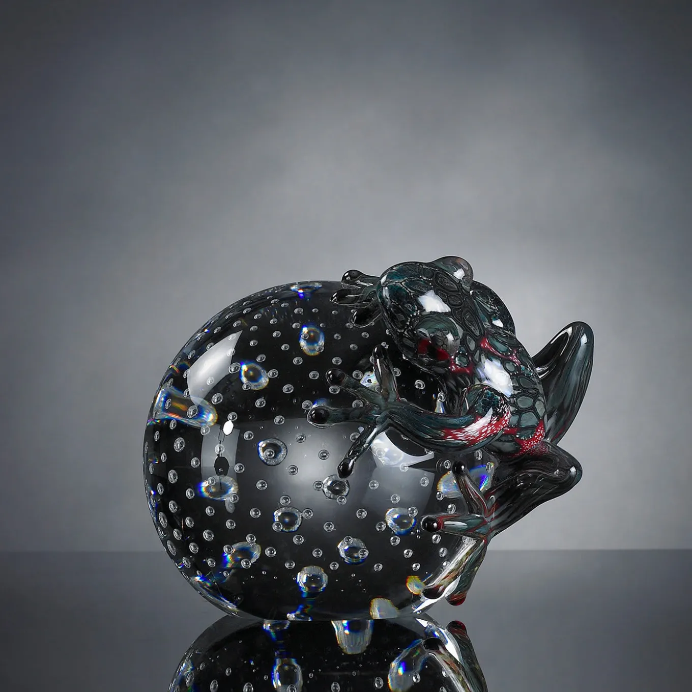 Characterized by a unique use of color, this figurine features a strikingly shaded petrol green frog resting on a transparent sphere enhanced by dancing bubbles encased within the layers of glass. This sculptural objet d’art is entirely handcrafted of glass by master artisans.
