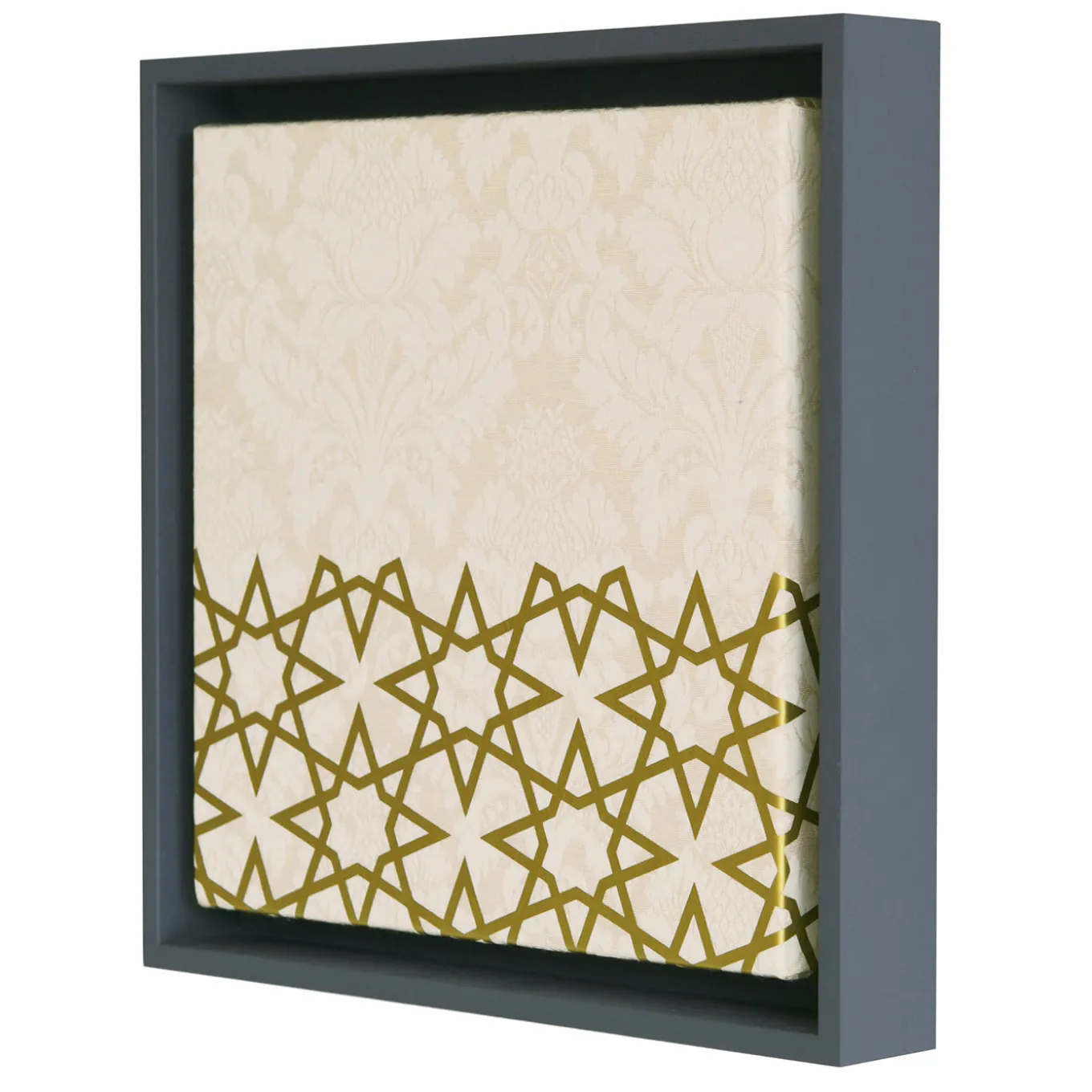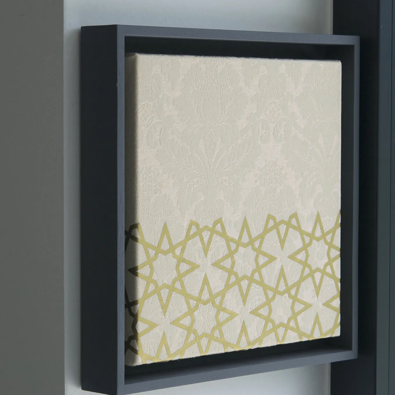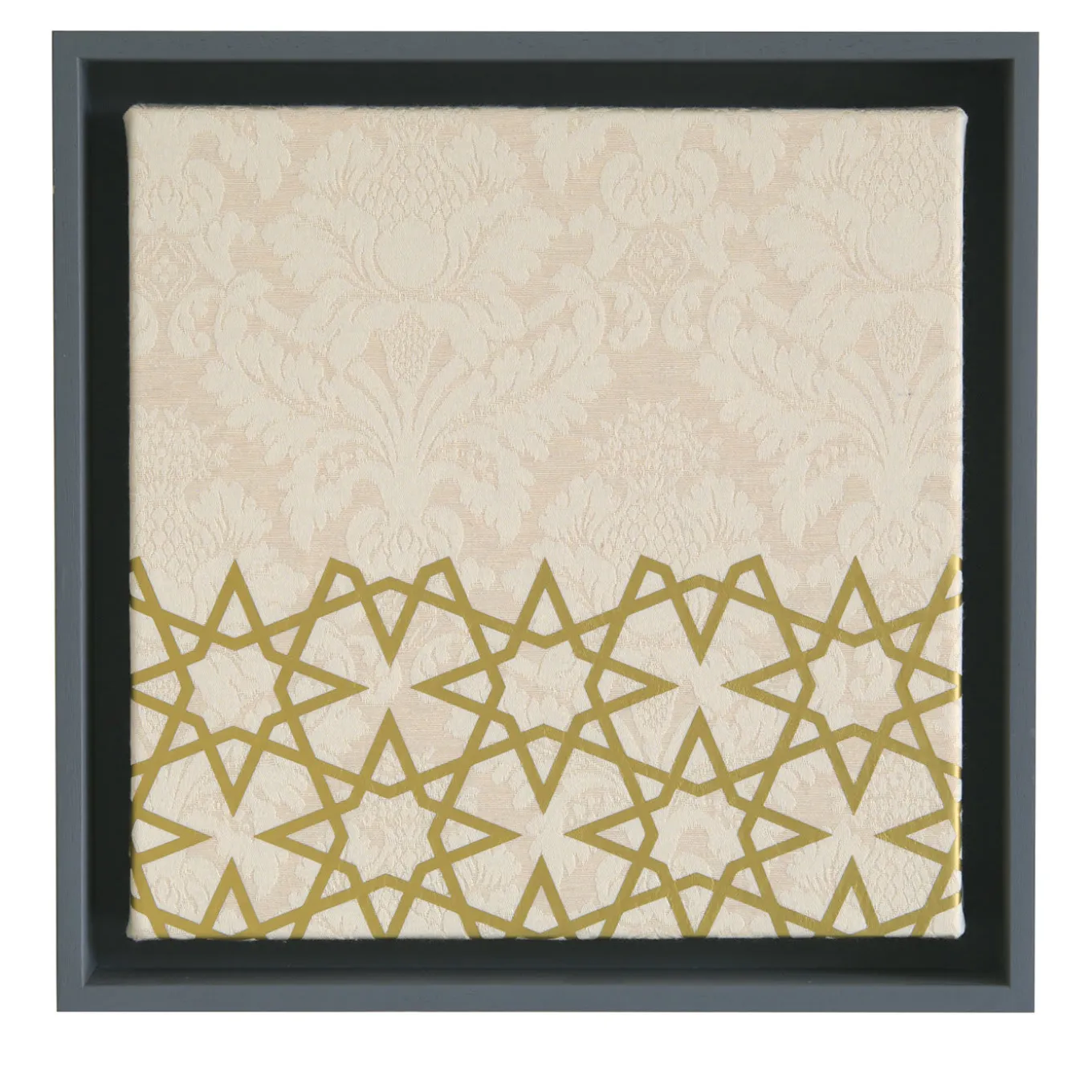 This panel by Amelia Corvino is a unique objet d’art that will infuse any interior with plush sophistication. A smaller version of the Grande Contrappunto, this piece is entirely handcrafted in the most prestigious Venetian workshops of refined beige damask. The wooden frame is available upon request. The classic pattern on the top of the piece is superbly contrasted to the Islamic art represented on the bottom, symbolizing a bridge between the West and the East in a harmonious artistic combination of different styles, like a musical counterpoint (“contrappunto” in Italian).