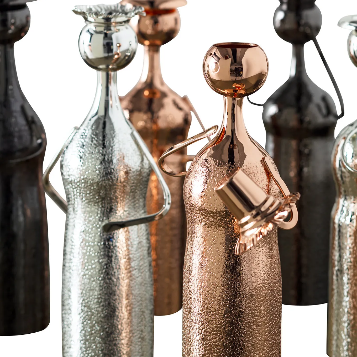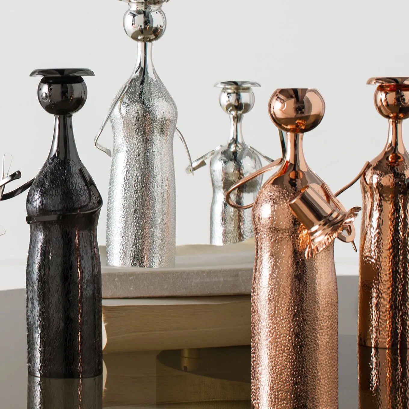 This exquisite vase takes its name from the playful and elegant shape: it is reminiscent of a small man with a hat (piccolo uomo con cappello in Italian). Made of silver with a partly shiny and bark texture, it may function as vase or candlestick. This piece is a sculptural work of art that will add an accent of luxury to any interior. The man’s hat can be used as a candle-holder, while, if removed, this unique sculpture becomes a vase.