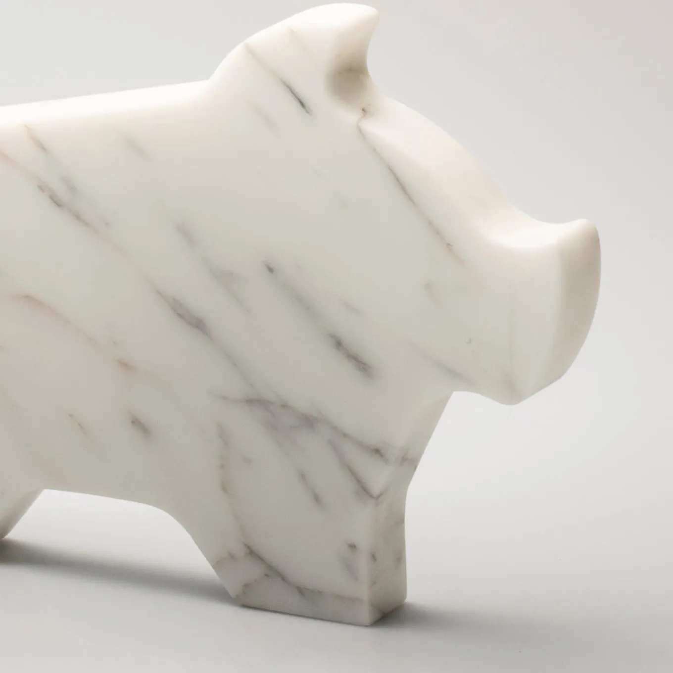 The simplicity and authenticity of farm life inspired Alessandra Grasso to design the Factory series of marble statuettes to which this design belongs. Shaped like a stylized little pig, it enchants with the beauty of its natural veins that lend timeless elegance to its playful personality. Suitable as an unconventional paperweight or as a simple decorative item, it comes in two smaller options and in a gray Grafite marble variant, please check the Artemest catalog.