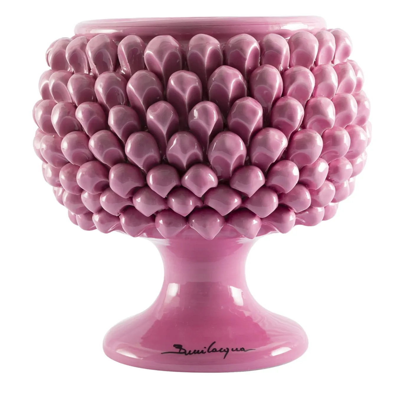 The pink Pigna vase with pedestal is a sensory journey. The soft white clay, carefully shaped by hand, is brought to life with water and vibrant pigments. These handcrafted ceramic forms embody and preserve a millennia-old cultural heritage, reflecting the essence of traditional craftsmanship. With its striking pinecone design and elegant pedestal, this vase adds timeless beauty to any space.