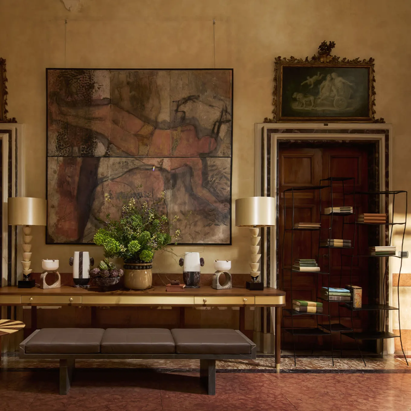 This striking piece of functional decor can be displayed alone or combined with the other Pike pieces, for a cohesive look. It was crafted entirely of ceramic with a crackle glaze finish on the sienna-colored surface. The delicate curves of its silhouette are adorned at the mouth with two rows of dark brown spheres that create a dynamic texture and unique decoration. Different colors are available. Please consult the concierge.